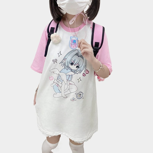 Elevate your style with our enchanting Kawaii Jirai Kei Style Pink Cartoon Print T-shirt! Crafted...