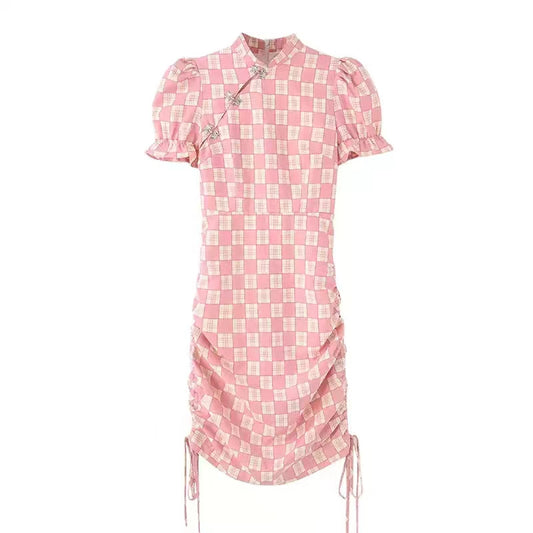 The Sweet Style Checkered Bun Cheongsam Dress from Fanlijia is the perfect combination of Chinese...