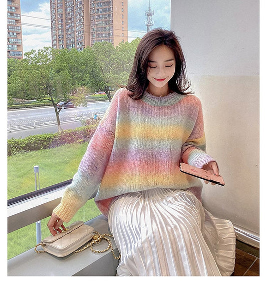 This Rainbow Gradient Stripe Loose Sweater is the perfect addition to your wardrobe for the...