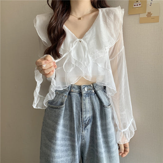 This Kawaii Plunging Sheer Falbala Crop Top is perfect for any modern woman who wants...