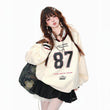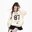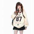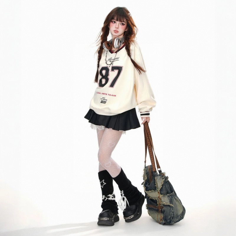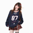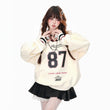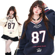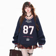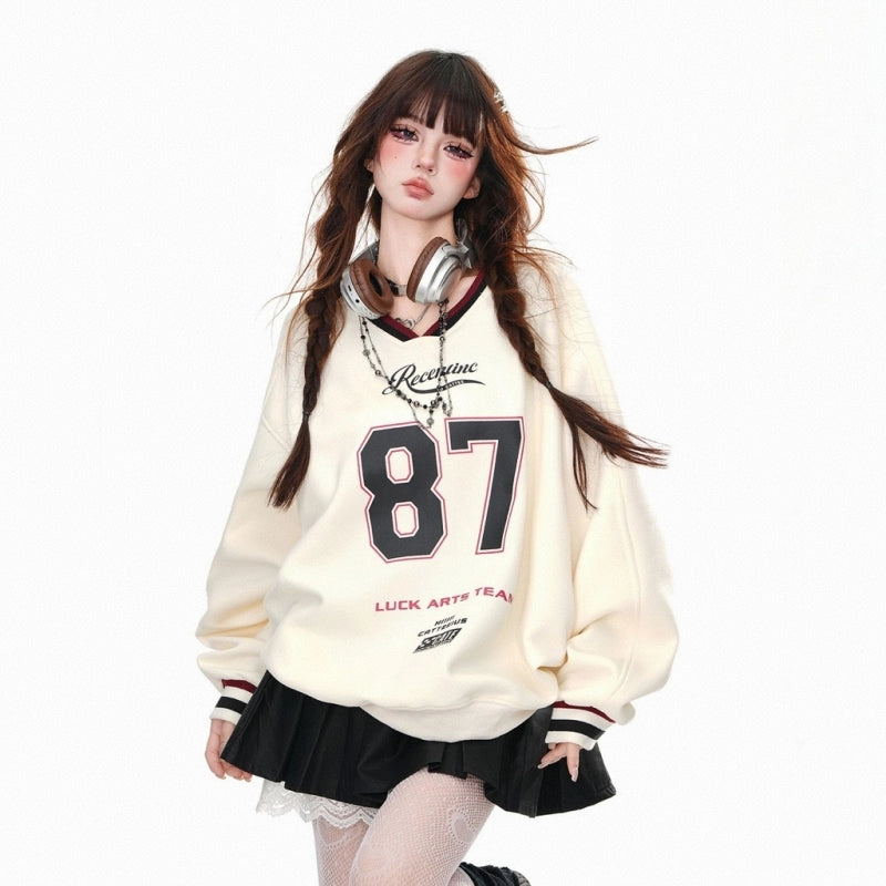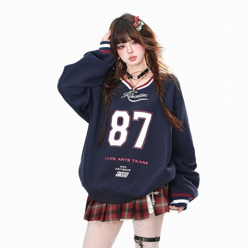 V-neck Long-Sleeved Sweatshirt: Step up your style game with our American college-inspired top. Perfect for spring and autumn. Available in apricot and navy blue.
