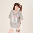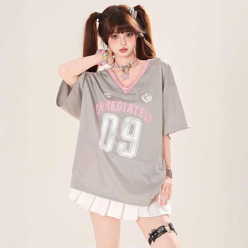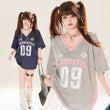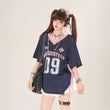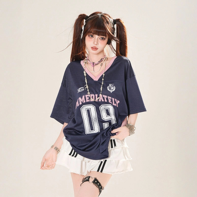 Shop the American Loose Blue Hollow V-neck T-shirt for a casual street style look! Soft polyester blend, perfect for summer days. Available in S, M, L.