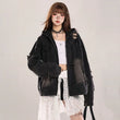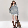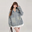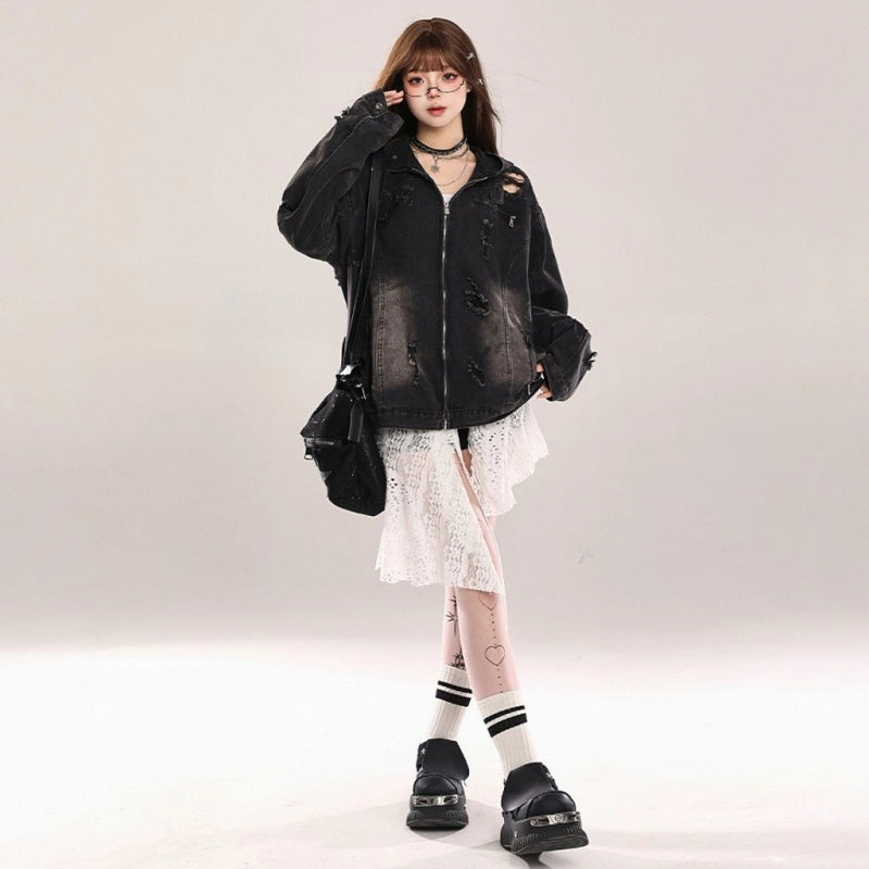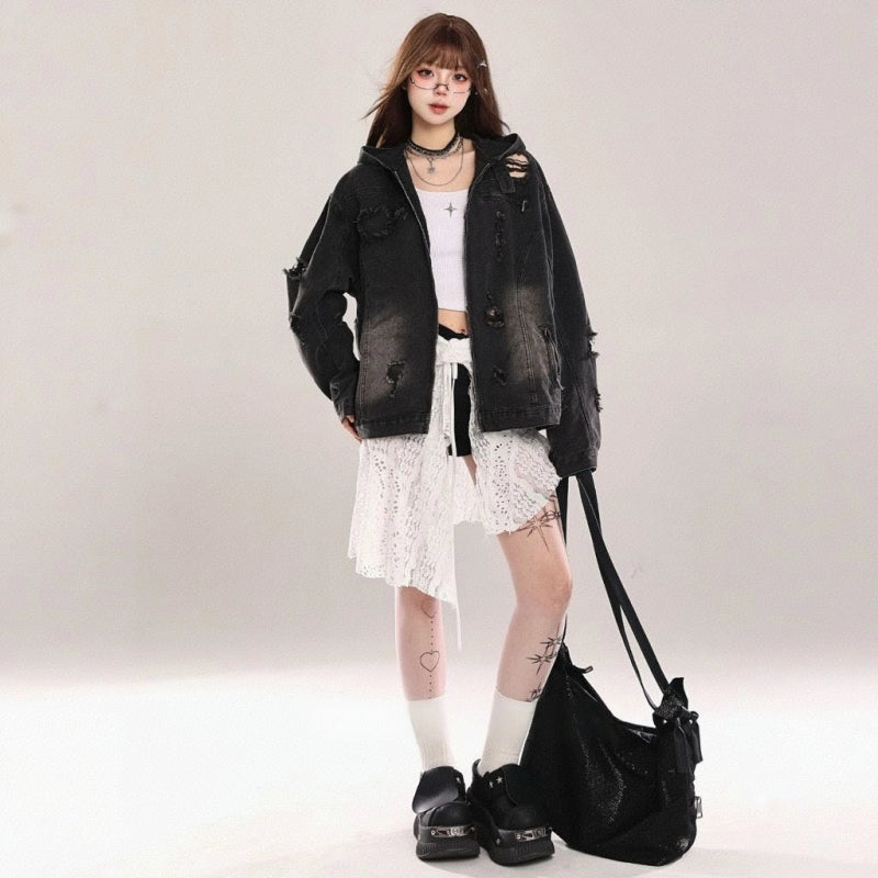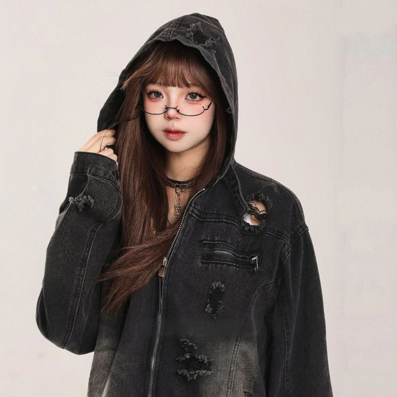 American Retro Ripped Denim Hooded Jacket: Discover the Spring 2025 collection with a loose fit and solid colors. Available in multiple sizes and shades.