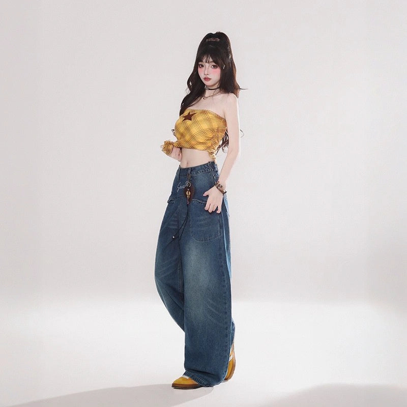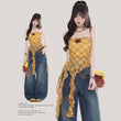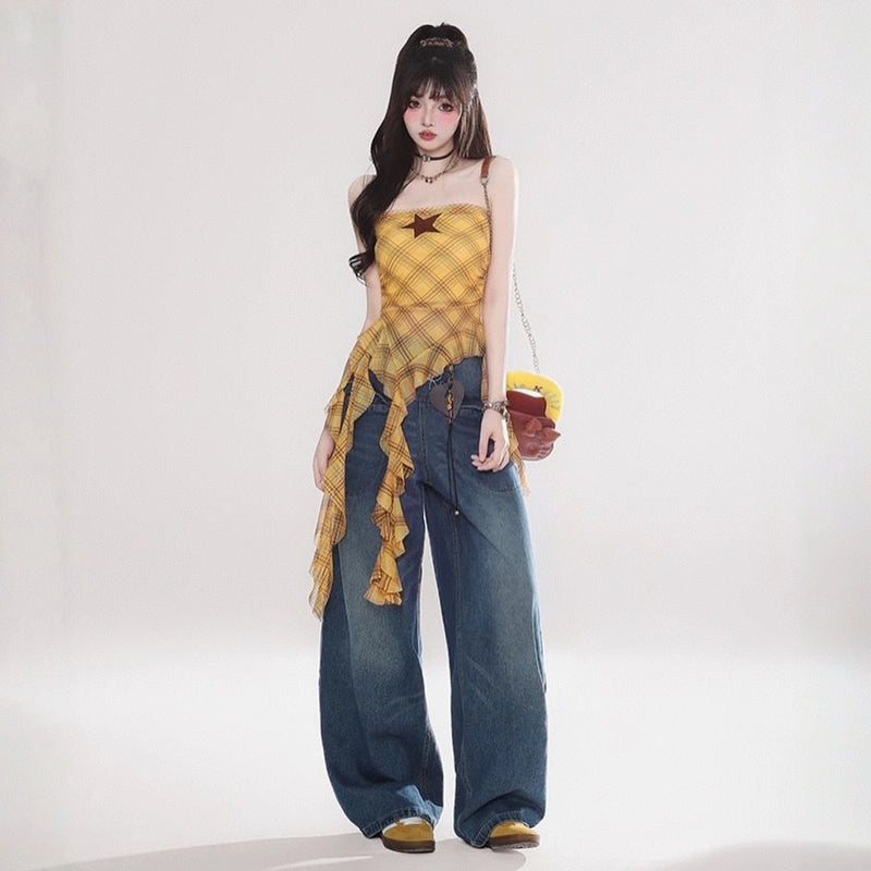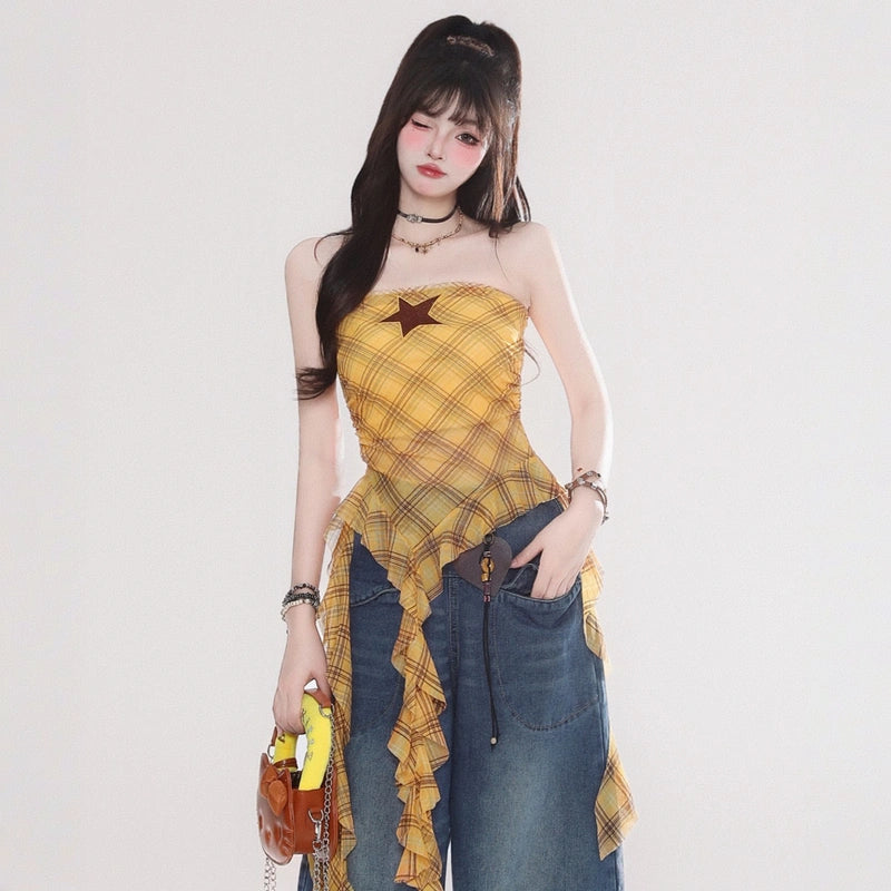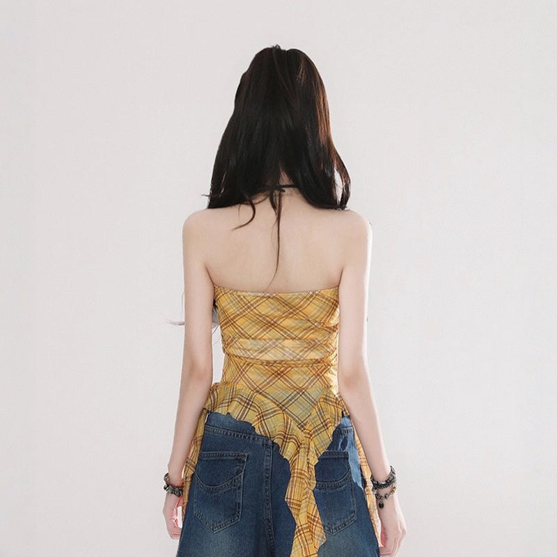 Discover the American Retro Yellow Plaid Tube Top! A chic, slim fit design with unique asymmetry and embroidery for your summer wardrobe. Sizes S, M, L!