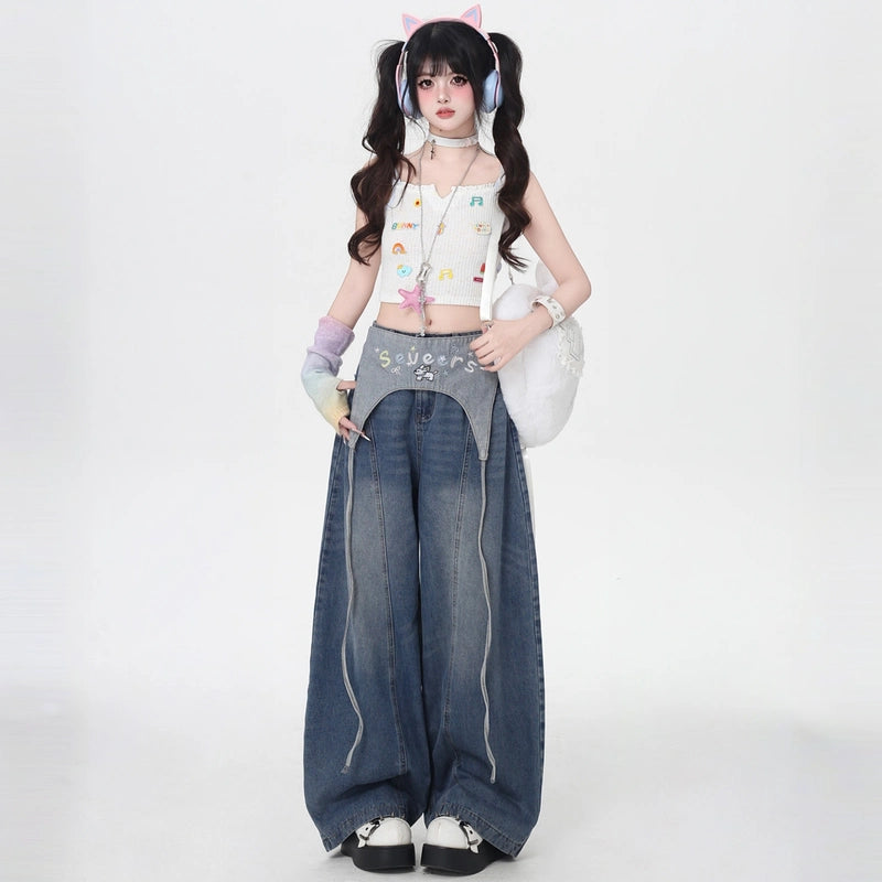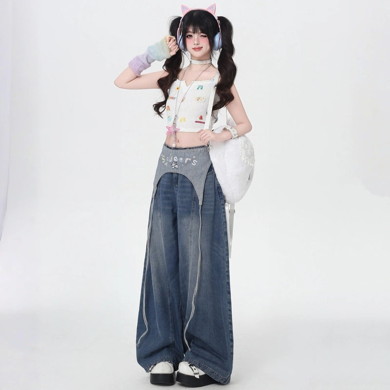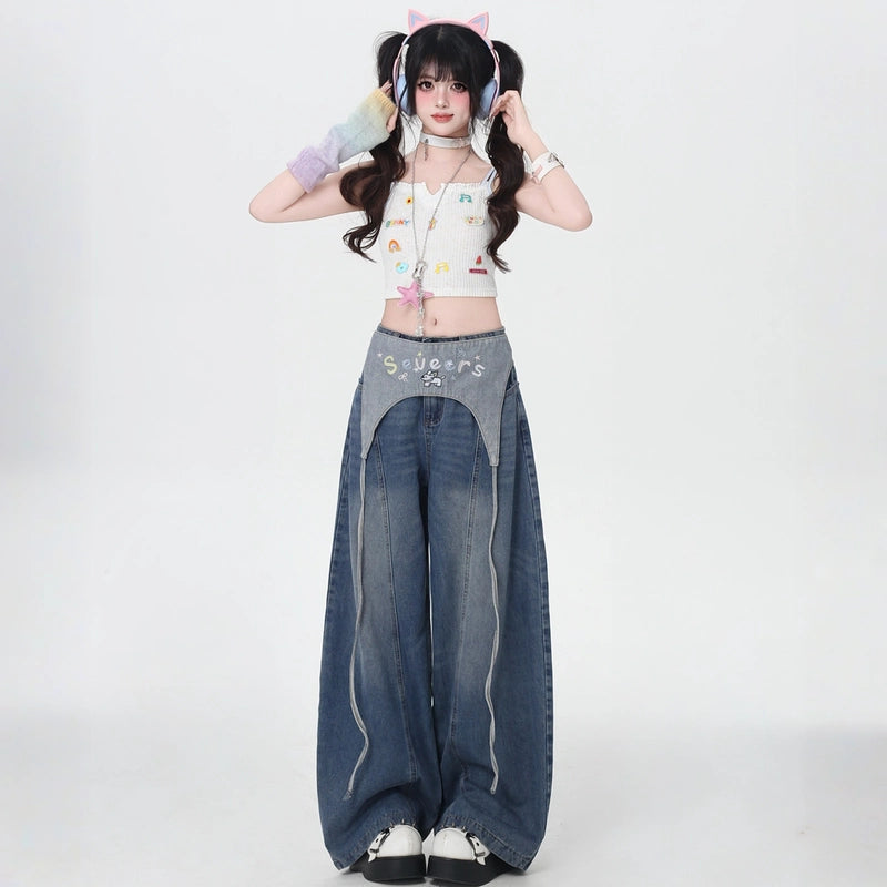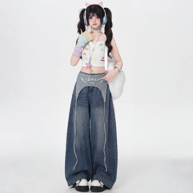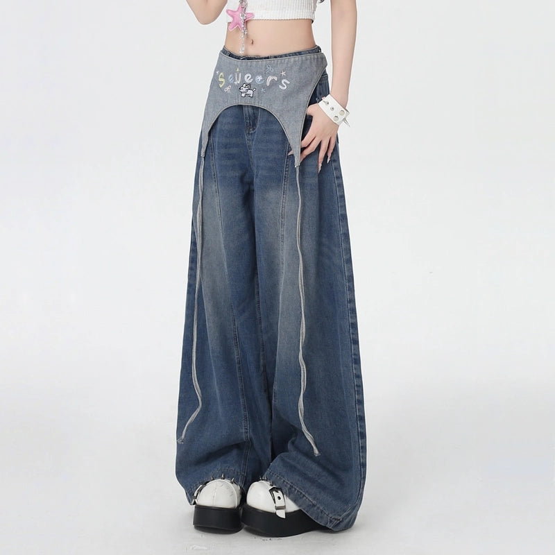 American-style embroidered blue wide-leg jeans offer a sweet, casual vibe. High-waisted and versatile, they're perfect for any occasion. Shop now!