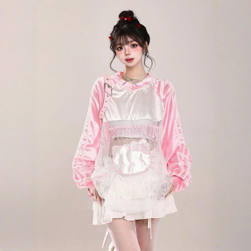 Discover the Hello Kitty Hollow T-shirt! This stylish long-sleeve blouse combines American charm with cute lace accents. Available in multiple sizes!