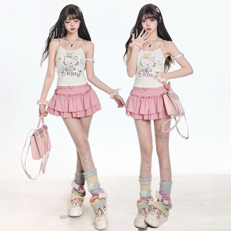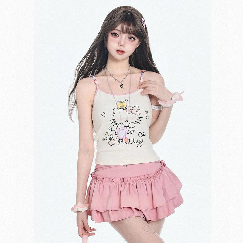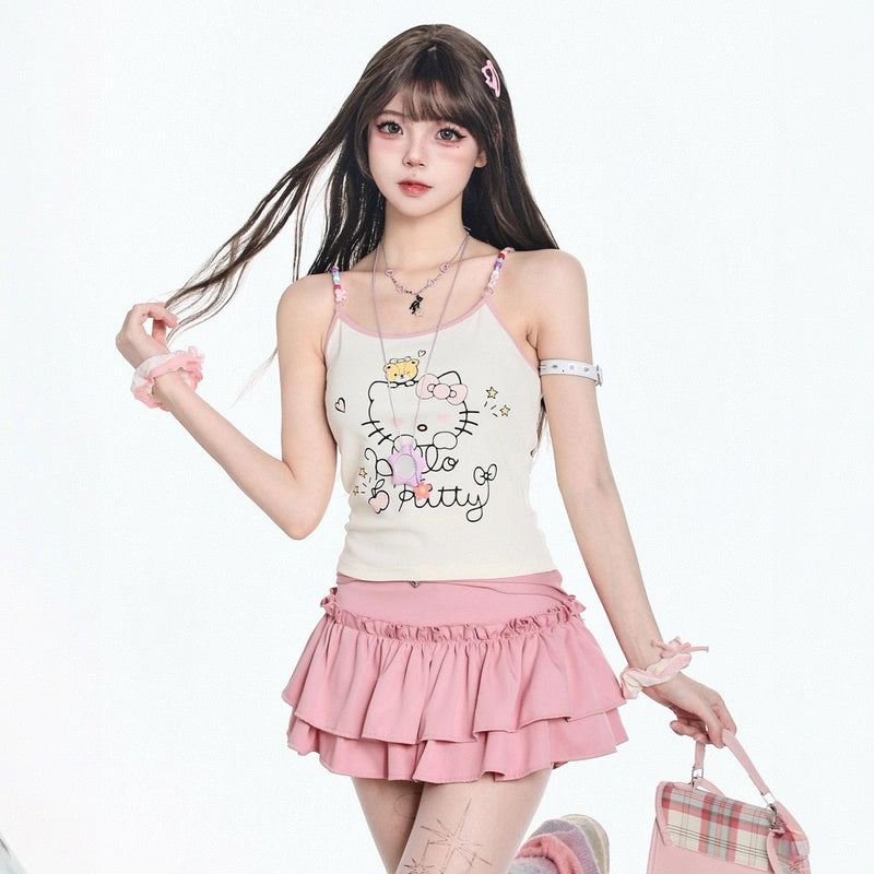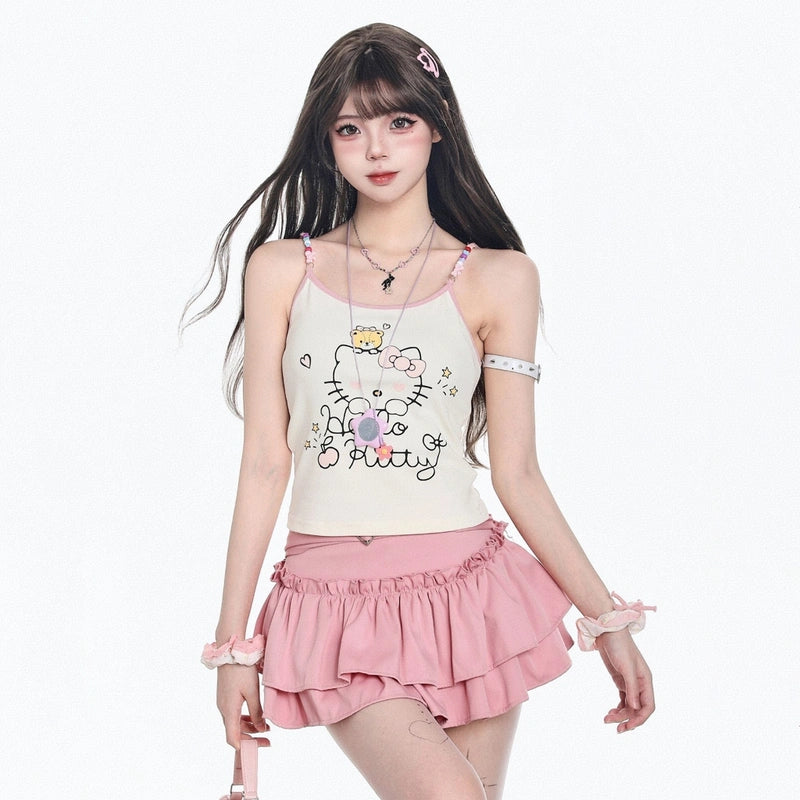 American Sweet Style Hello Kitty Printed Vest: A versatile, slimming summer essential for girls. Available in apricot, S, M, L sizes. Shop now!