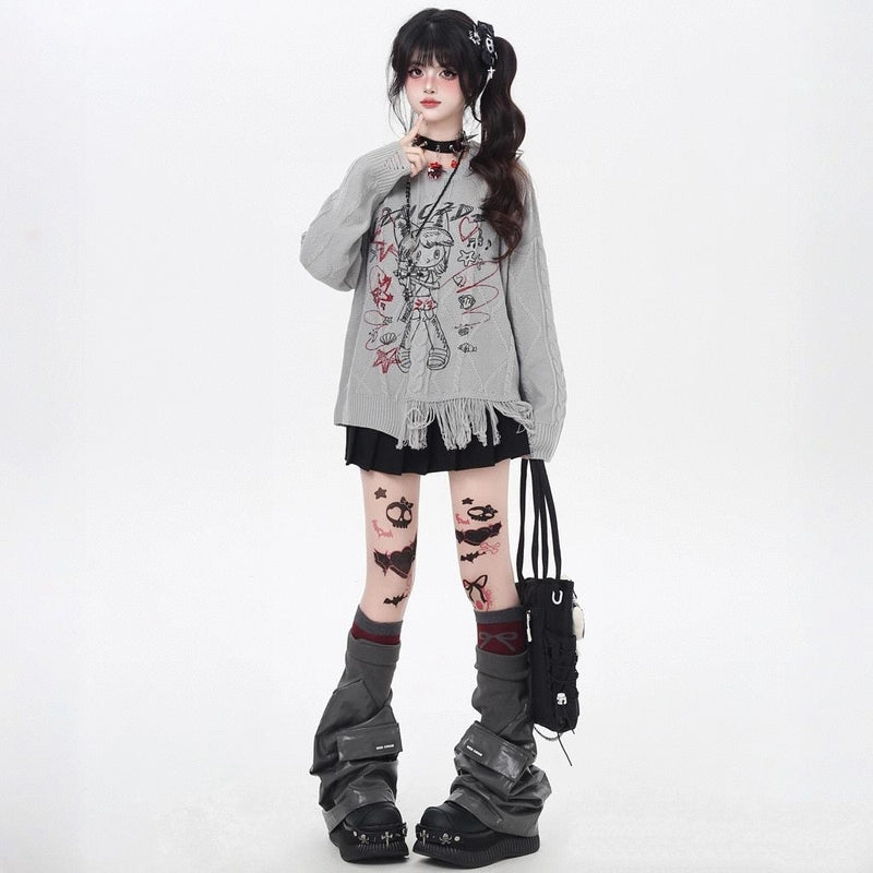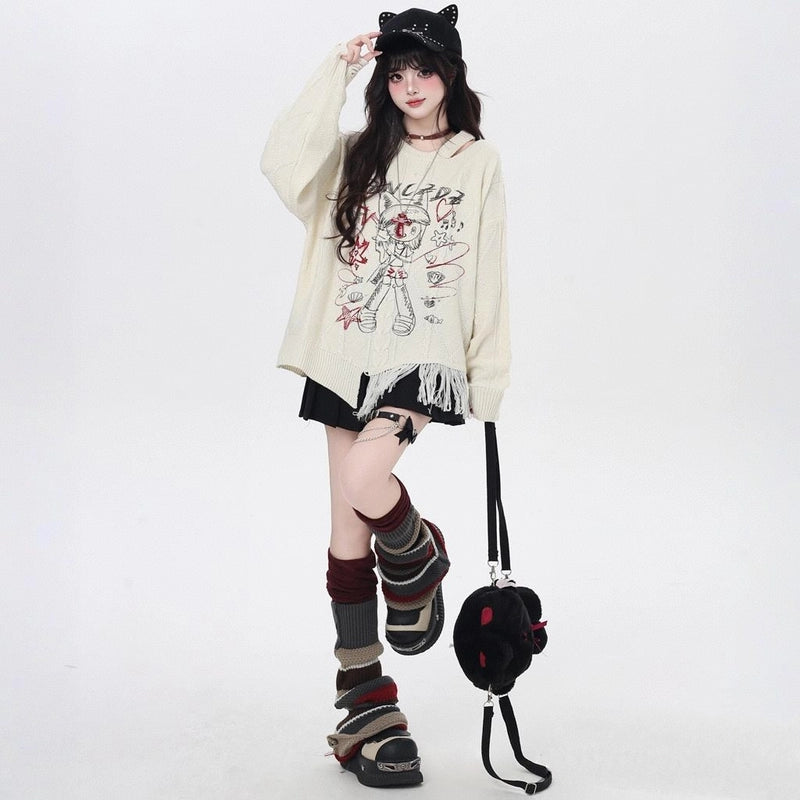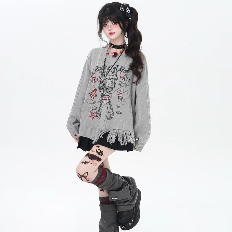Embrace cozy vibes with our Anime Girl Graffiti Print Pullover Sweater! Irregular tassels and a relaxed fit make it perfect for autumn/winter styling.