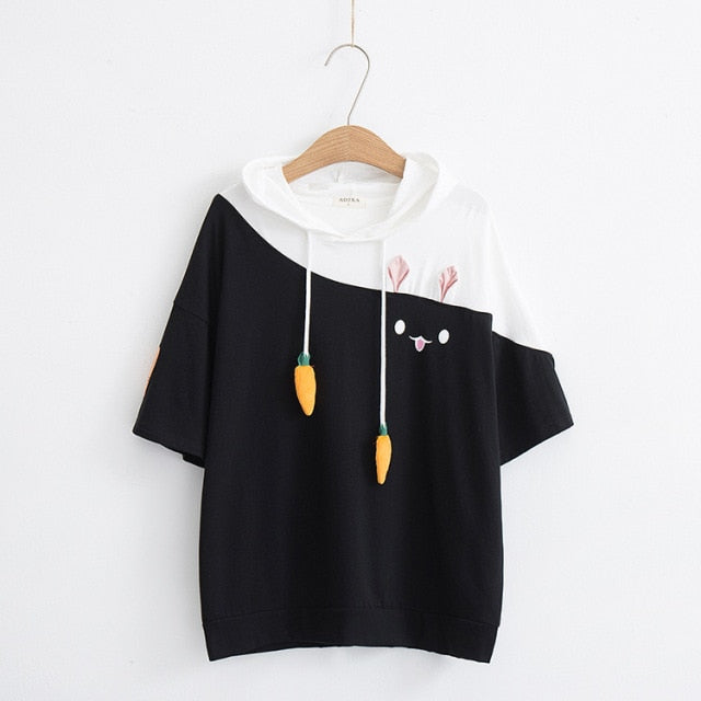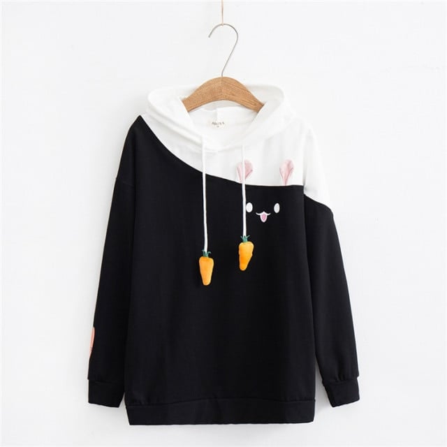 For all you ladies looking to harness your inner bunny, this comfy top is for you. The Carrot Bunny hoodie features a cute animal graphic on the front with whimsical colors of pink and black. With long sleeves, it looks great over jeans to make your outfit complete! These are made from Polyester blend fabric which is soft and durable--perfect for everyday wear!