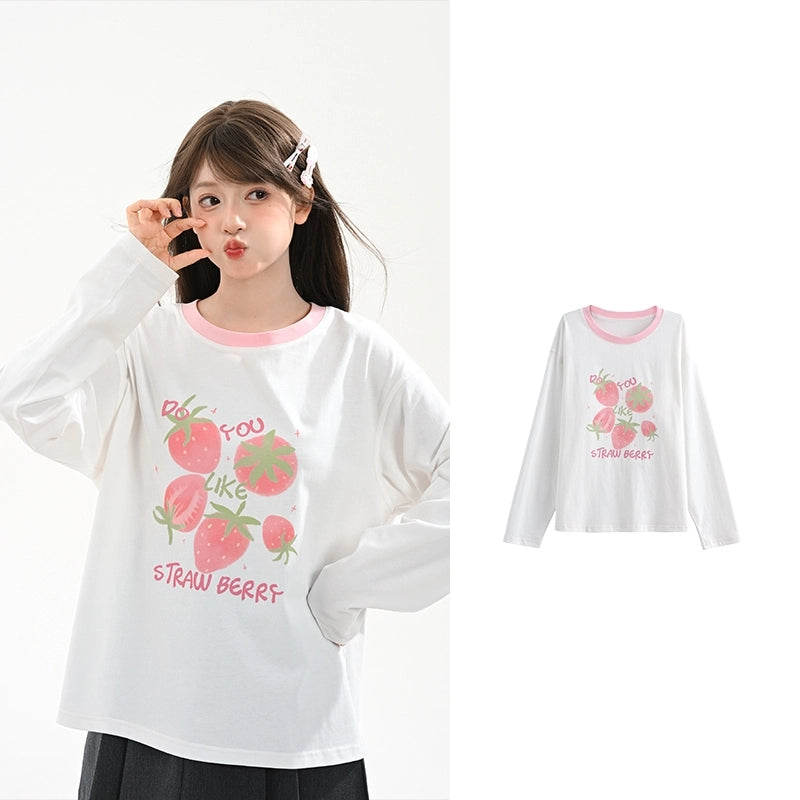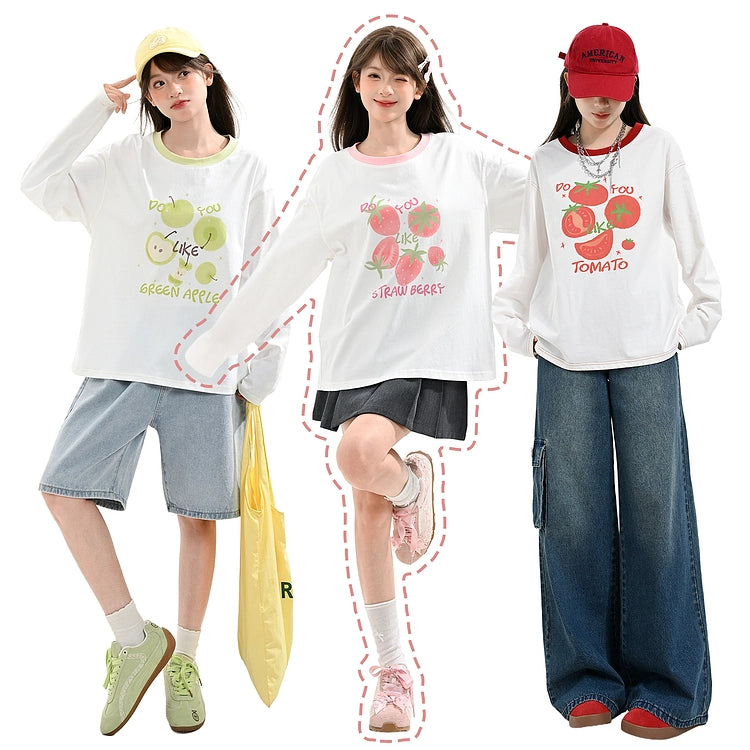 Brighten up your everyday wardrobe with our Cute Cartoon Fruit Print Long-Sleeved T-Shirt. Made from 100% cotton, this comfy and breathable top is designed with a loose fit and round neck for casual, all-day wear. The fun contrast colour fruit prints—choose from green apple, pink strawberry, or red tomato—add a playful kawaii touch to your style. Perfect for pairing with jeans, skirts, or layered outfits, this versatile tee is ideal for relaxed daily fashion. Available in sizes S, M, L, it’s a must-have for anyone who loves cute and casual clothing.