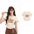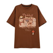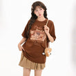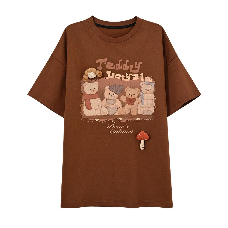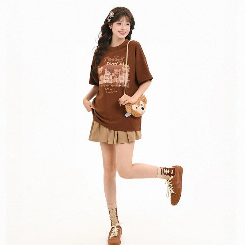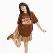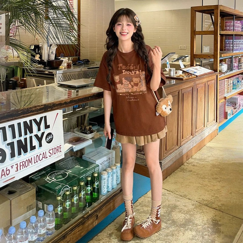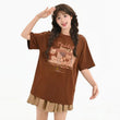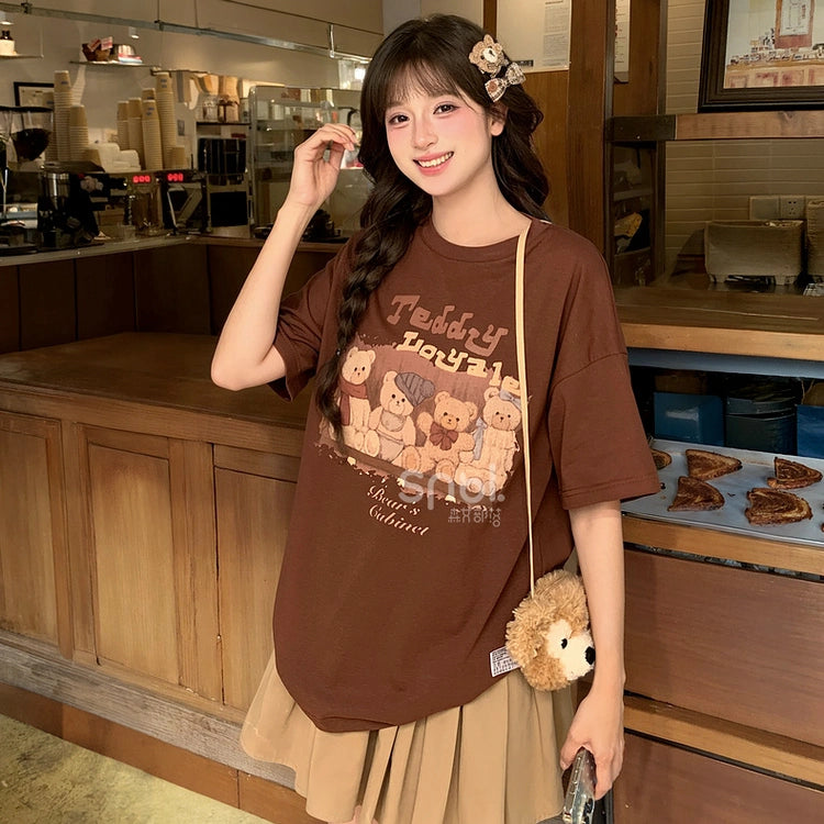 Adorable Brown Cartoon Bear Print T-shirt for women! This loose, short-sleeve tee combines retro charm with a playful design. Shop sizes S, M, and L!