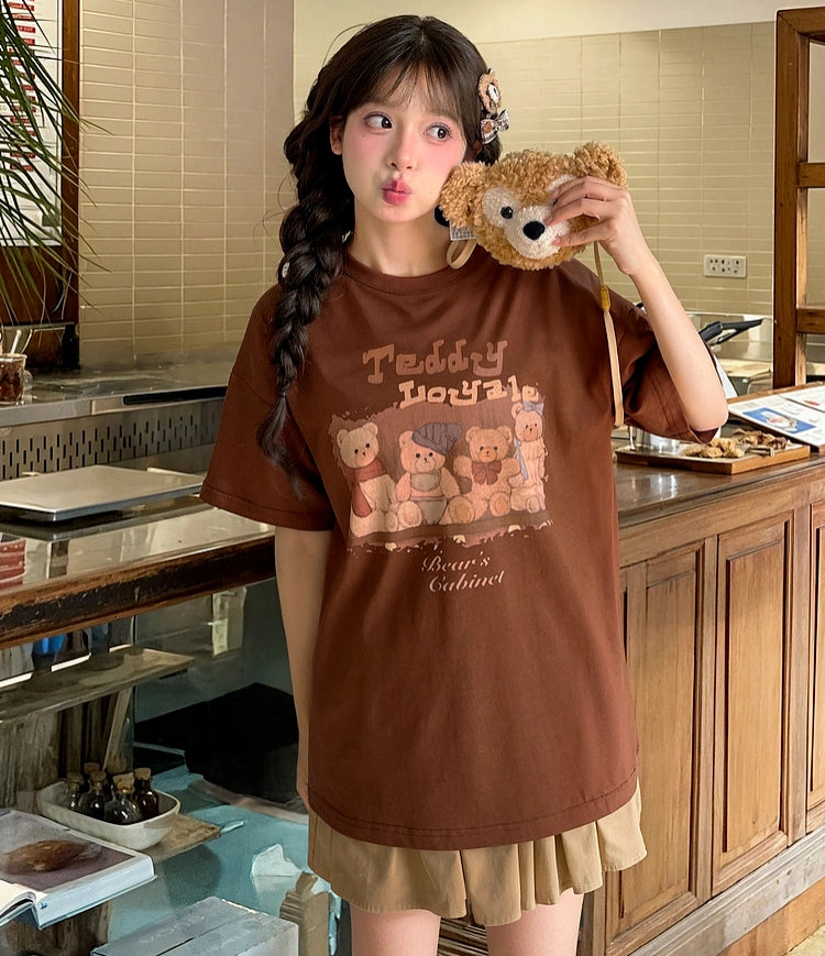 Style details: printing, three-dimensional decoration Style: cute style, sweet, college Type classification: loose type Pattern: cartoon bear Fabric: polyester Sleeve type: short sleeve Size: S, M, L Color: brownPackage Includes: