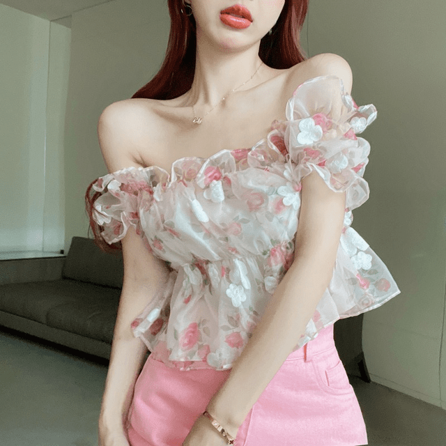 This floral print off-the-shoulder chiffon short T-shirt is sure to become one of your favorite wardrobe staples! The loose and flowy fit makes it perfect for hot summer days, while the stylish off-the-shoulder neckline adds a touch of sophistication. You'll love the feminine ruffles and patchwork details.