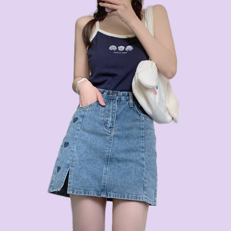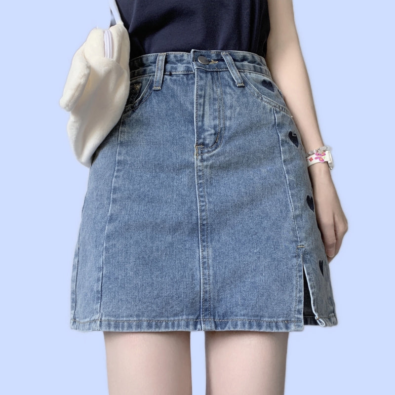 This summer, give her a unique and fashionable look with the Girls Solid Color Heart Embroidered Denim Skirt. This sweet and stylish denim skirt features a classic A-line shape and is highlighted in beautiful shades of gray and blue. Perfect for any occasion, it has an undeniably Japanese feel thanks to its heart embroidery details. The natural waist design makes it ultra flattering while the size options S, M, L make sure she always feels comfortable when wearing it.