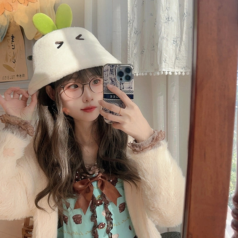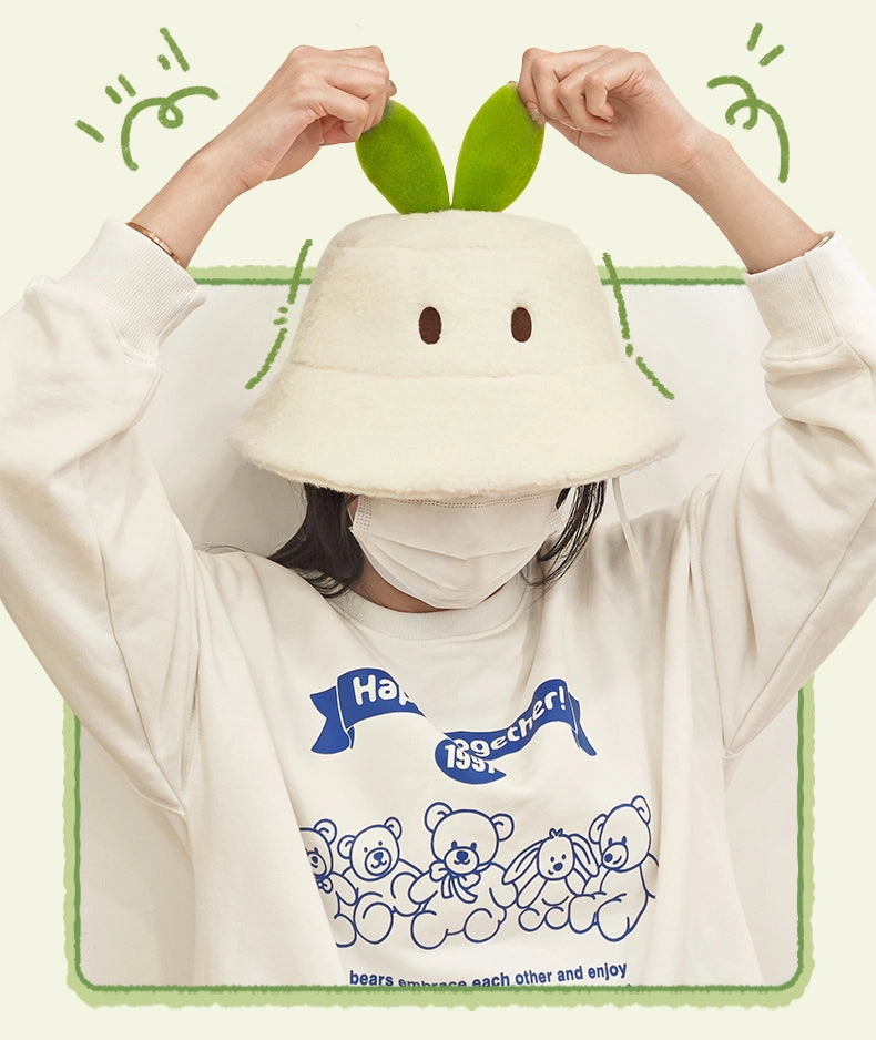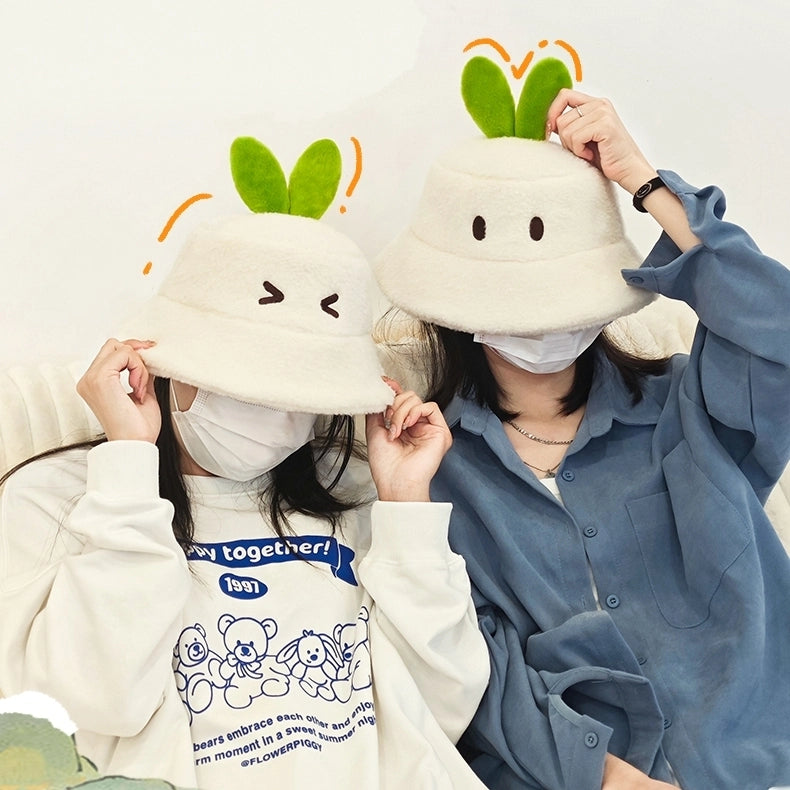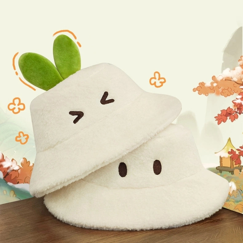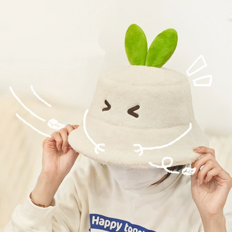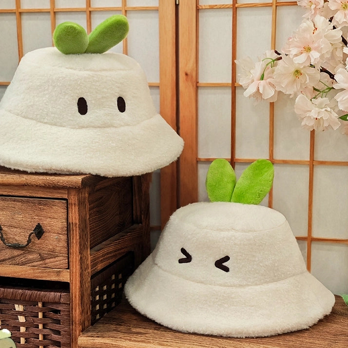 Radish Bucket Hat: Embrace autumn with this adorable, plush hat! Soft, warm, and flattering — perfect for chilly days. Get your kawaii style now!