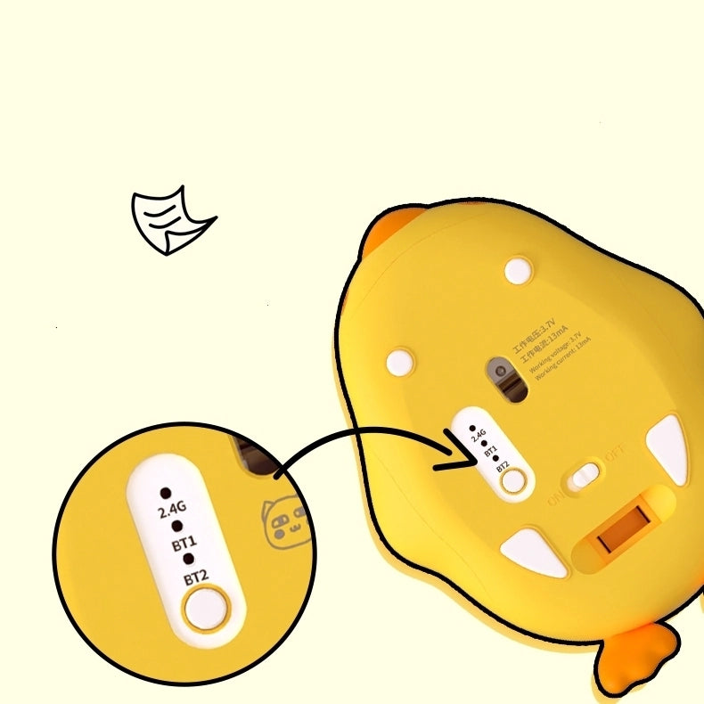 Basic Specifications Styles: Duck, Penguin, Yellow Duck, White Duck Engineer: Optical Resolution: 1400 DPI Key lifespan: 3 million+ clicks Weight: 80g + 5g Dimensions: 119.4x88.3x44.5mm Electrical Specifications Operating Voltage: 3.7V Operating Current: <7mA Sleep Current: 2.7mA in the first range; 0.3-0.7mA in the second range Deep Sleep Current: 10μA Transmission Specifications Connection: 2.4GHz, BT1 5.0, BT2 5.2 Repo Rate: 125HzPackage Includes: