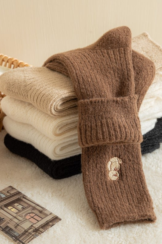 Functional use of socks: keep warm size: one size Fabric main material: wool pattern: plain style: sweet Applicable gender: female Color: Double-needle embroidery bear - black Double-needle embroidery bear - white Double-needle embroidery bear - brown Double-needle embroidery bear - beige Double-needle embroidery bear - khaki Crotch style: ordinary crotch Applicable season: winter Tube height: high tube Thickness: Thickened Clothing style details: piled socks Even number: 1 pairPackage Includes: