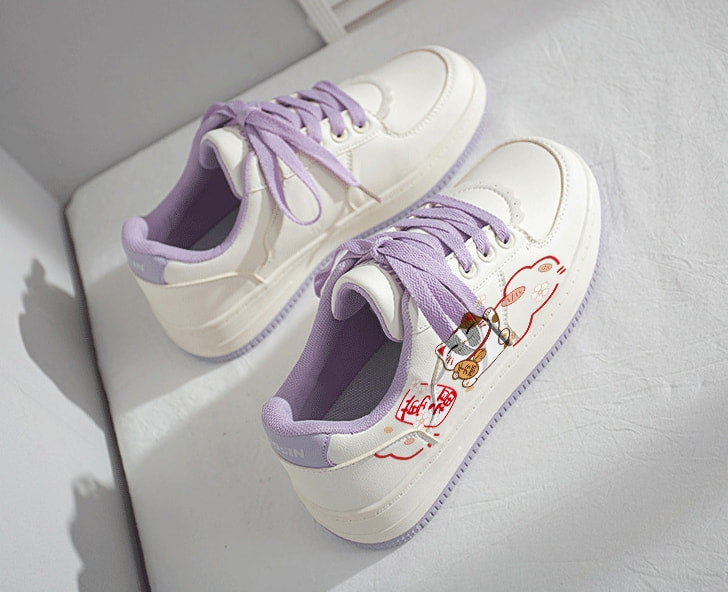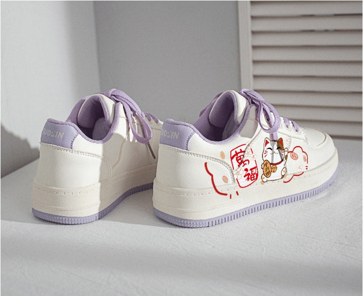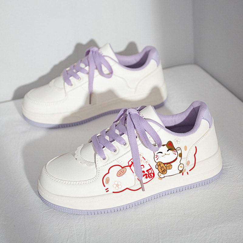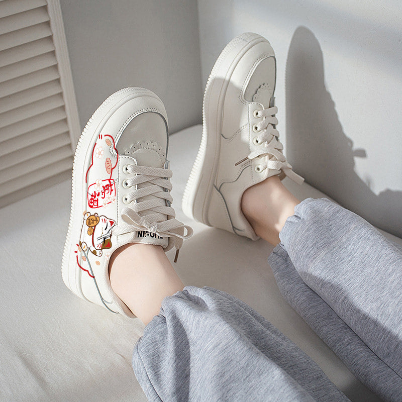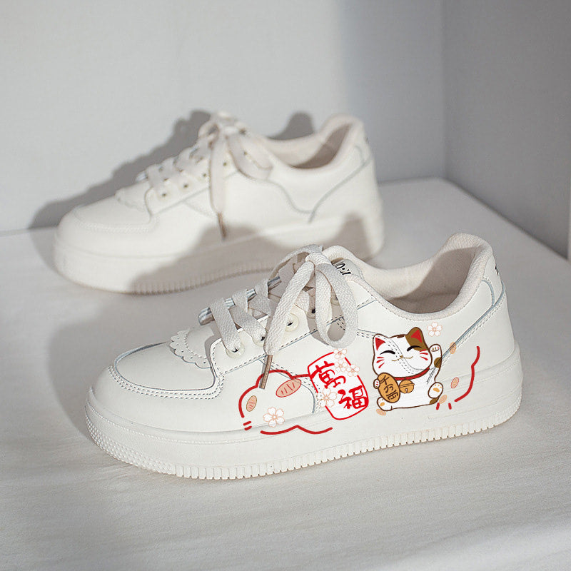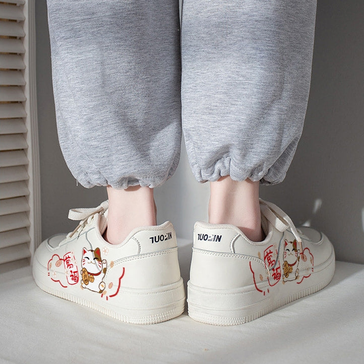 Kawaii Japanese Style Hand-Painted Lucky Cat Print Sneakers