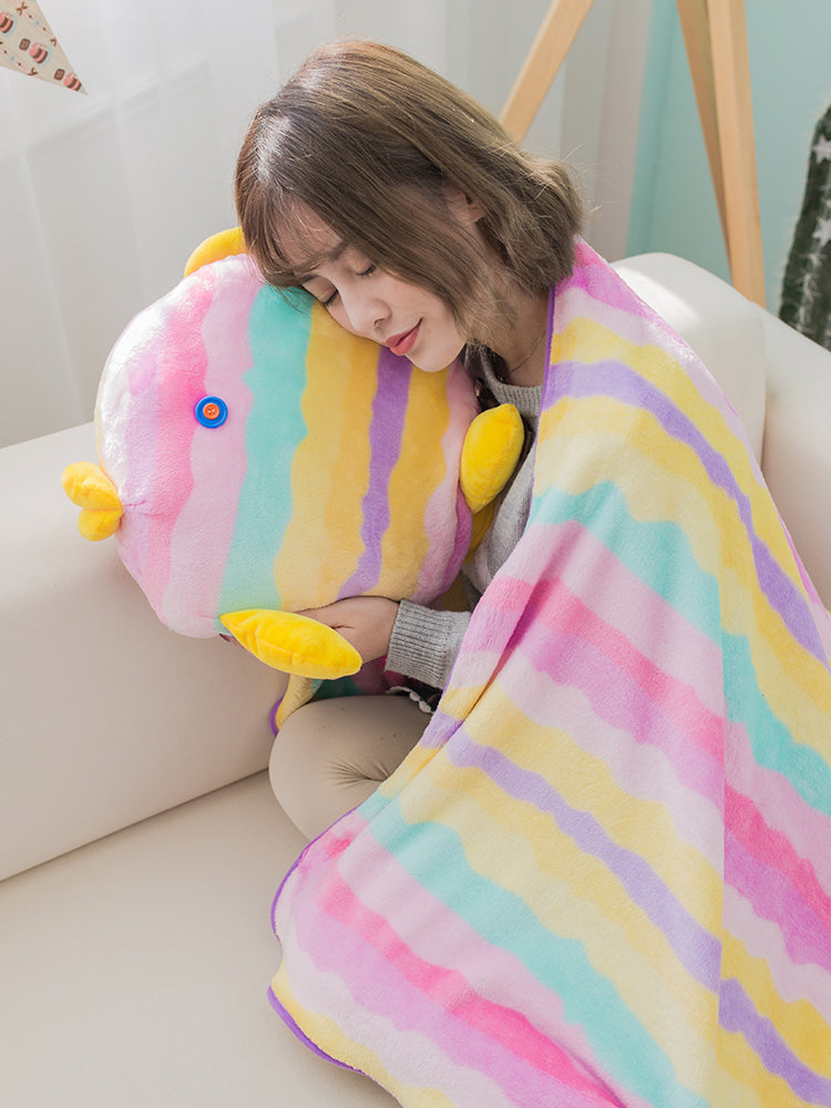Kawaii Kiss Fish Plush Pillow And Quilt 2 in 1 is the perfect combination of comfort and convenience. Enjoy a cozy nap wherever you go with this adorable three-in-one set. The plush pillow and quilt are made from soft coral fleece, keeping you warm and snuggly at all times. Plus, it's multi-functional - use it as a pillow for when you travel or spread out the quilt to relax on the couch or floor.