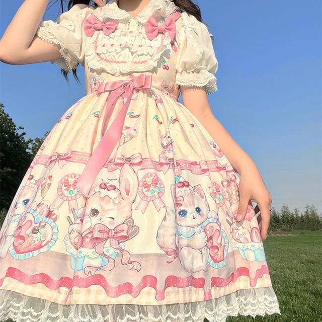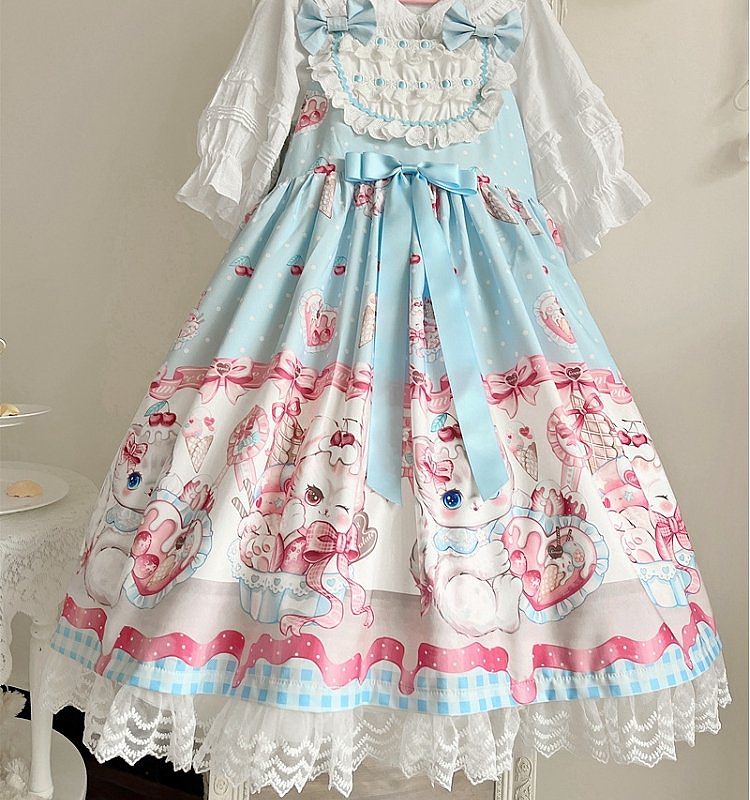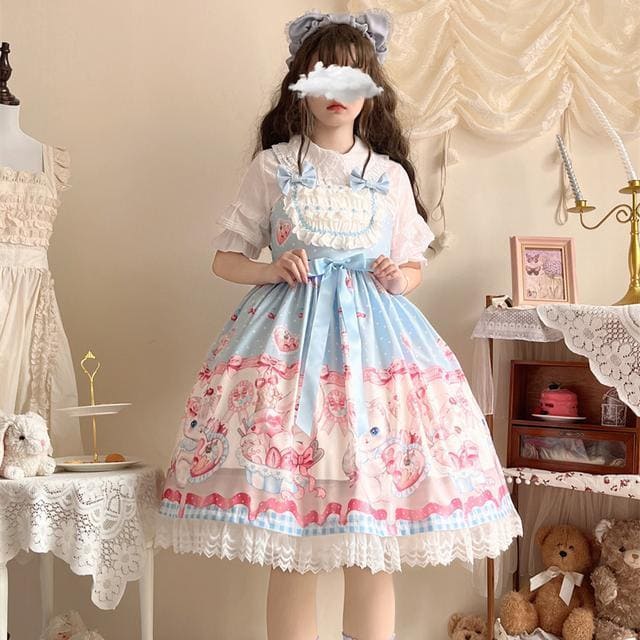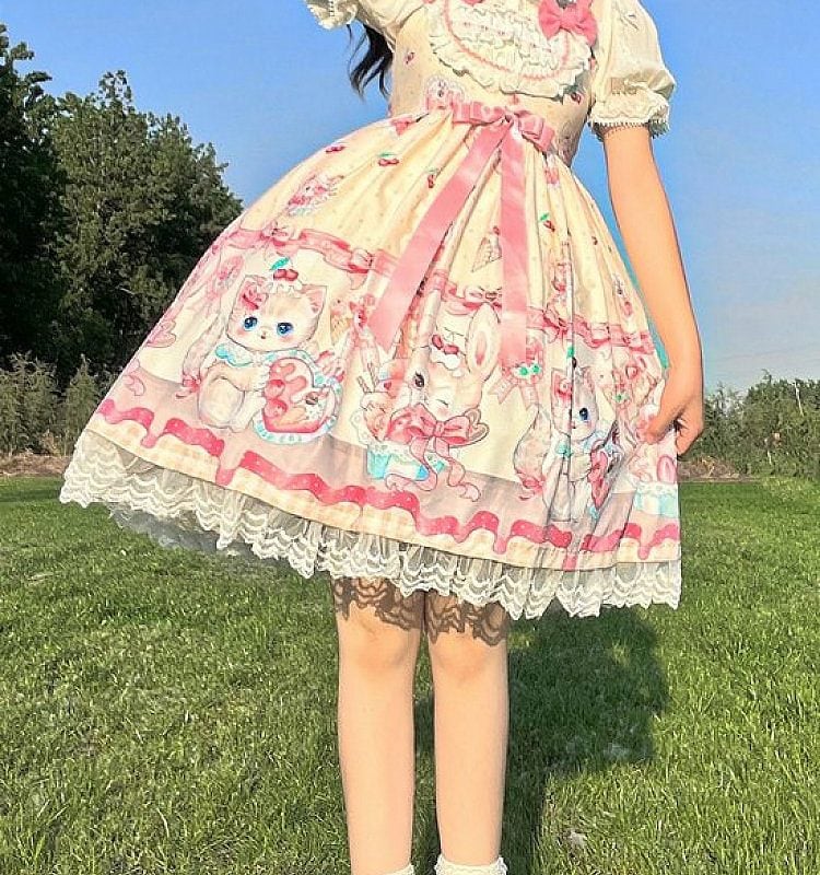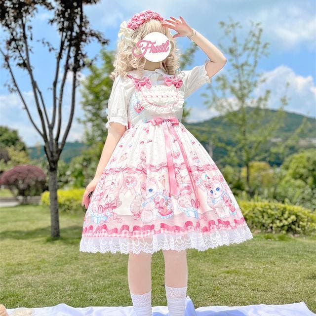 This Kawaii Kitty Print Lolita Jsk Dress is perfect for summertime tea parties or any other special occasion! The intricate lace bow and strawberry bunny print make this Lolita dress absolutely adorable, and the soft, flowy fabric will keep you cool and comfortable all day long. Whether you're looking for a unique and charming dress to add to your wardrobe or a gift for your favorite fashionista, this is the perfect pick!