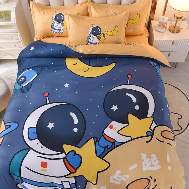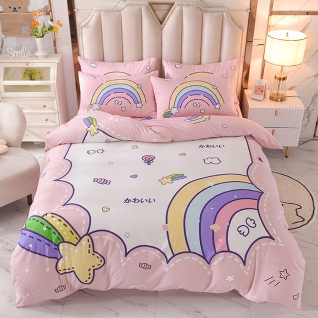This Kawaii Rainbow Space Bedding Set is perfect for anyone who wants to add a touch of fun and whimsy to their bedroom. The bright colors and adorable designs will bring a smile to your face every time you enter your room. The sheets are made of soft, high-quality cotton, and the fitted sheet has extra deep pockets to accommodate any mattress size. This Kawaii Bedding Set also comes with a duvet cover and two pillowcases, so you can complete the look.