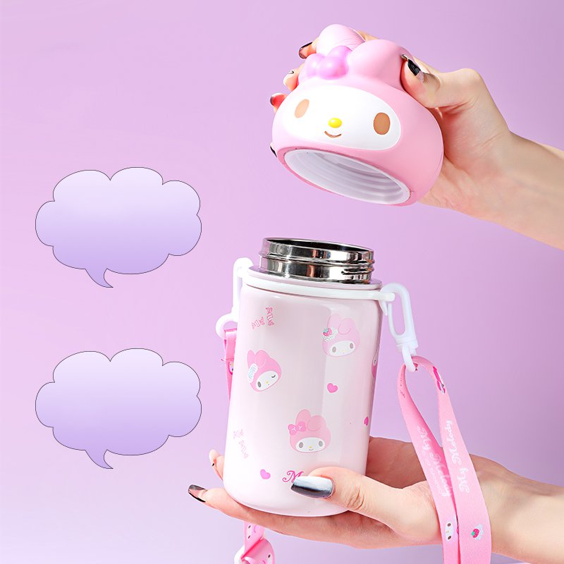 Introducing the Kawaii Sanrio Kuromi Cinnamoroll Doll Portable Water Cup! This wonderful cup is perfect for on-the-go and features a strap for easy carrying. The insulation keeps your drinks cold or hot, making them ideal for any weather. The cute Sanrio Kuromi design will make you smile every time you take a sip!
