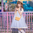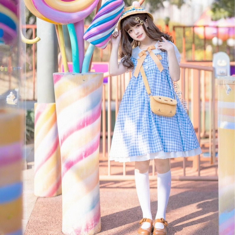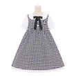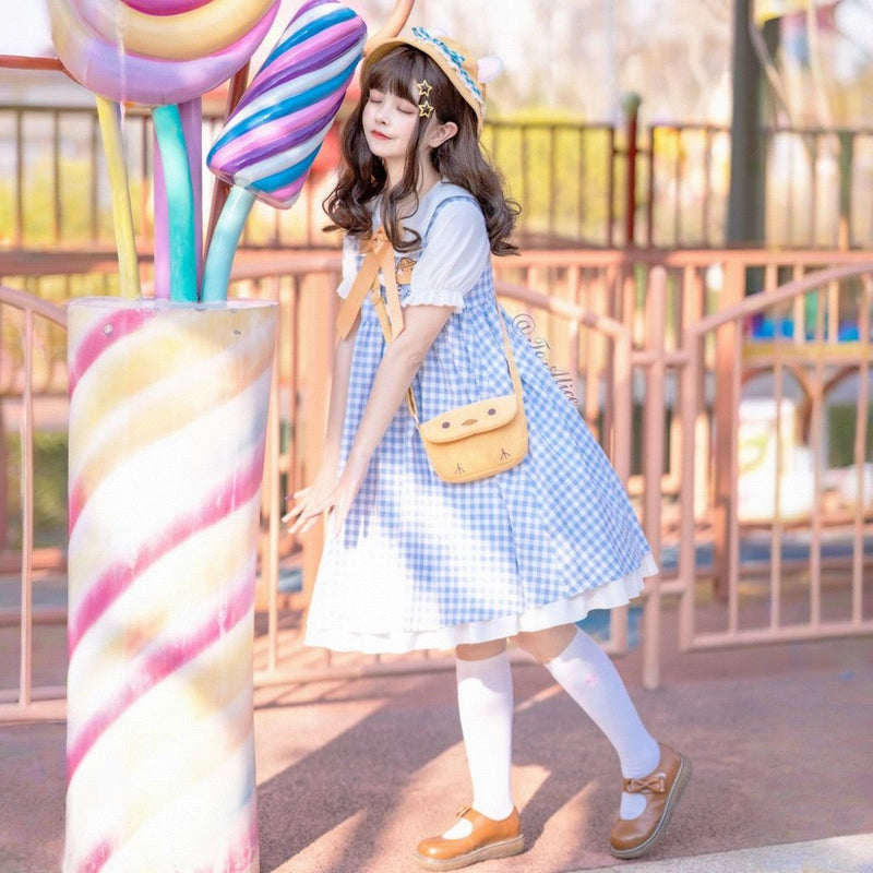 Discover the Kawaii Yellow Chicken Plaid Dress! Soft cotton fabric in cute colorblocks — light blue, pink, or classic black/white. Sizes S and M available!