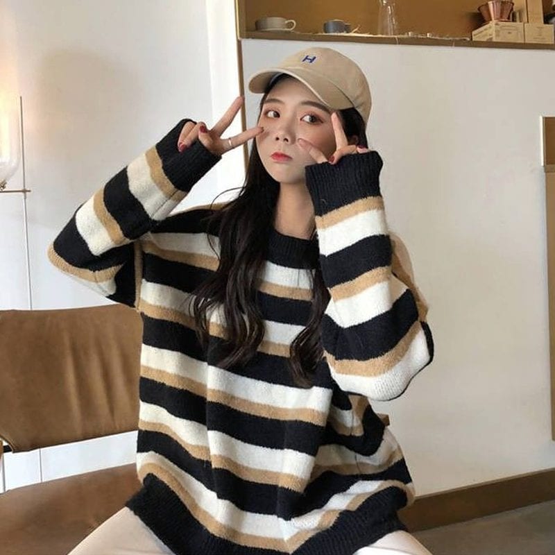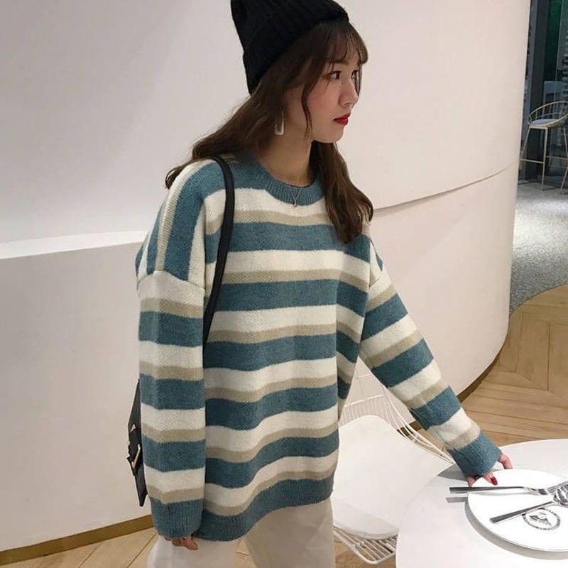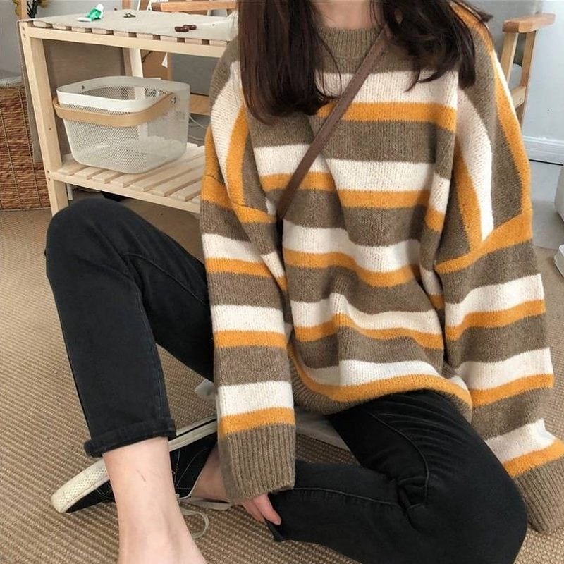 This Korean Striped Loose Sweater is the perfect addition to your winter wardrobe! The soft and cozy fabric will keep you warm all winter long, while the stylish stripes add a touch of personality. Whether you're headed to class or out for a coffee date, this sweater will keep you looking chic and comfortable.