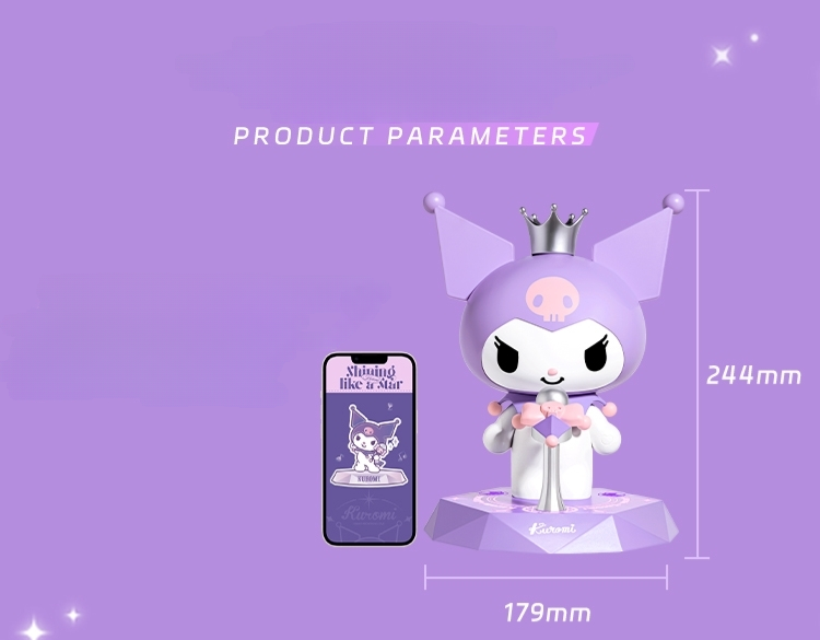 Product name: Kuromi Bluetooth Speaker Gift Box Product model: MG22-40 Product size: 179*177*244mm Packing size: 217*197*283mm Product net weight: 567g Play music working time: about 6.5H Battery capacity: 2000mAh Product material: ABS, PVC, silica gel, NdFeB, lithium-ion battery Charging time: about 3H Rated input: 5V=1A (MAX) Rated power: 5W Bluetooth connection distance: 10M Bluetooth version: 5.2 Battery type: Li-ion battery Battery capacity: 2000mAhPackage Includes: