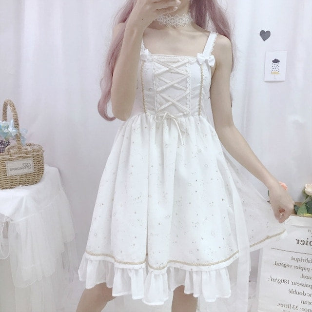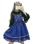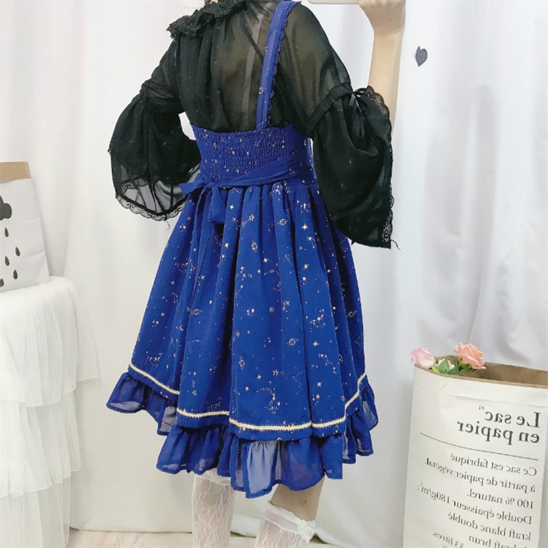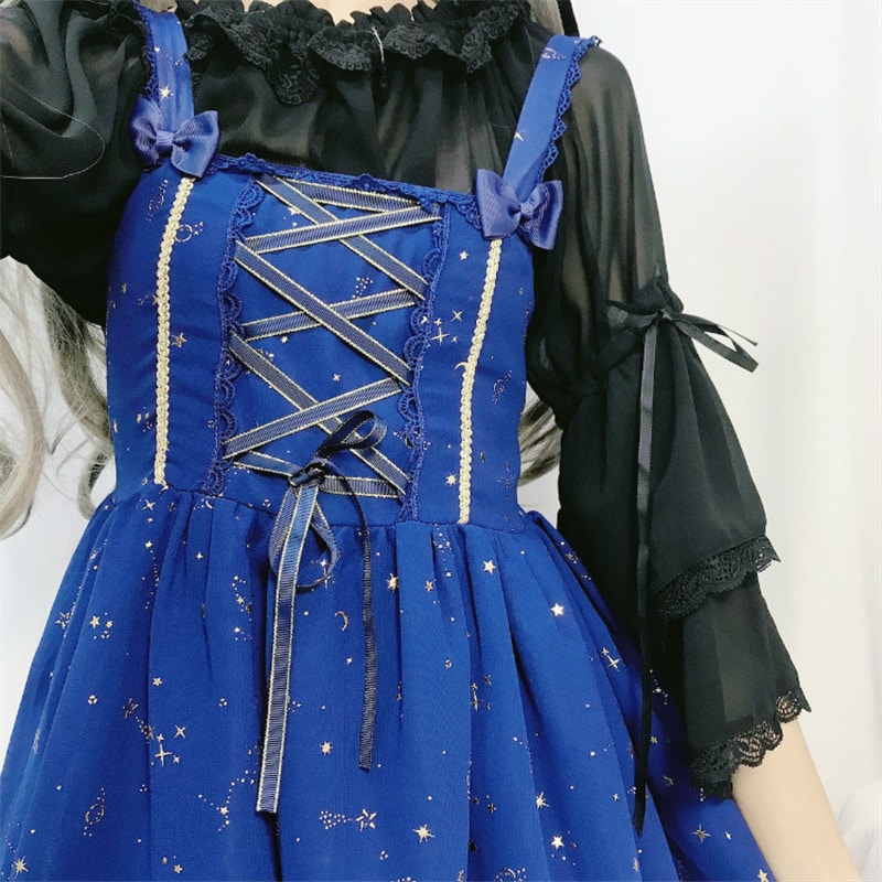 The Lolita Slip Dress With Bowknot is the perfect summer dress for any girly girl. Made from a soft and lightweight fabric, this dress features a beautiful Japanese star sky print, with blue stars against a black background. The straps are adjustable, ensuring a comfortable and flattering fit, while the bowknot detail at the waist adds a touch of femininity.