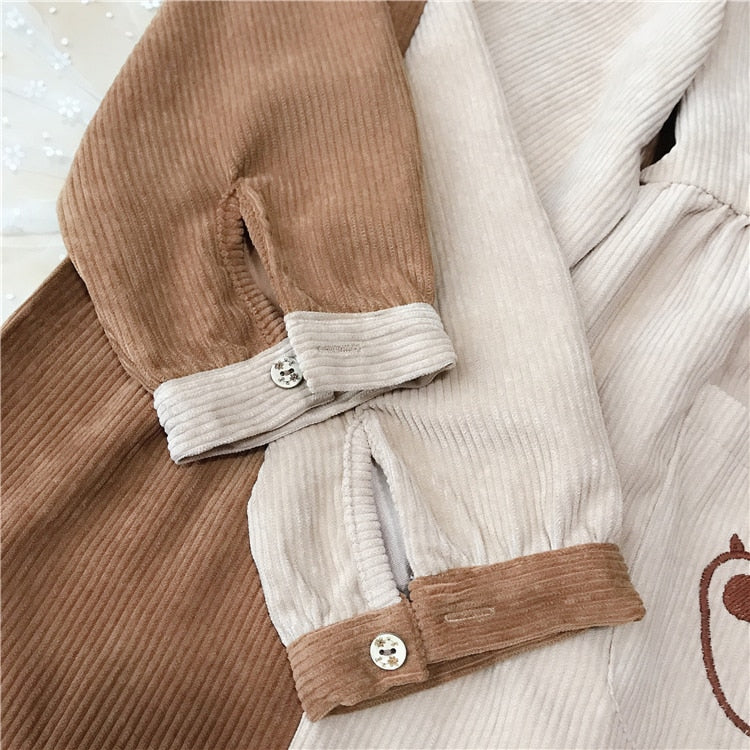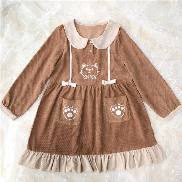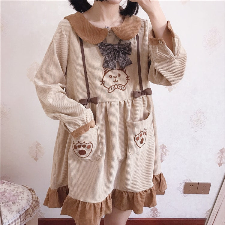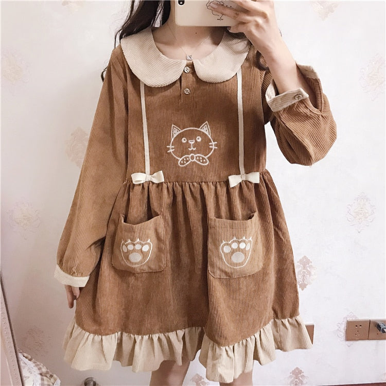 Mori Girl Kawaii Cat Corduroy Dress