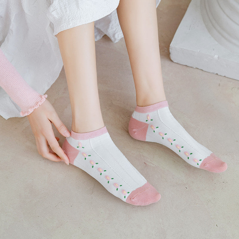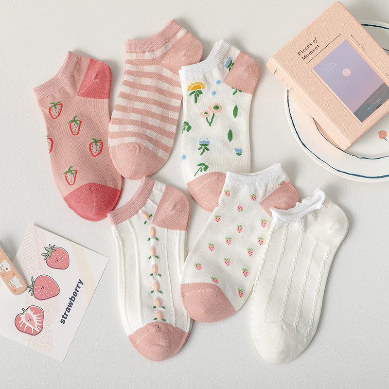 Introducing the new Pink White Short Socks – a stylish, lightweight, and all-purpose design for women who want to stand out from the crowd. These uniquely designed socks feature a sweet Japanese strawberry motif, making them perfect for casual everyday wear and special occasions alike. Ultra-thin fabric makes them comfortable in spring and summer weather, while low-top boat styling gives your feet an elegant silhouette. With these fun and fashionable socks, you'll always make a positive impact when stepping out in style!
