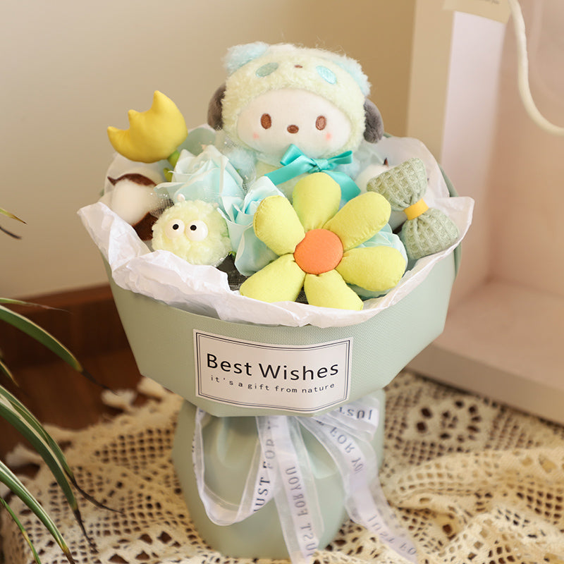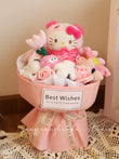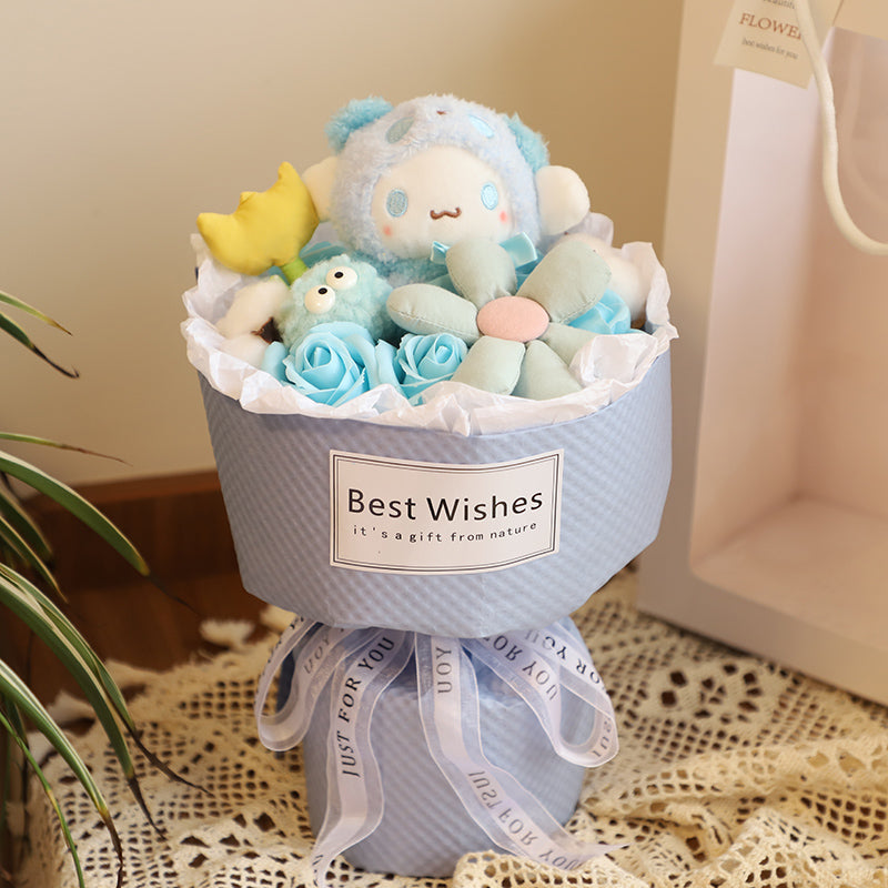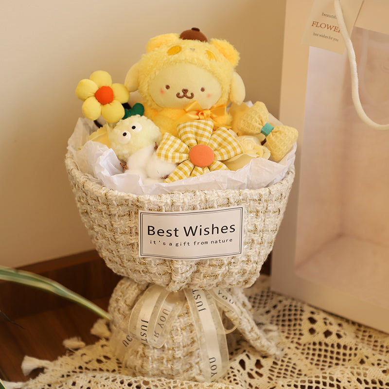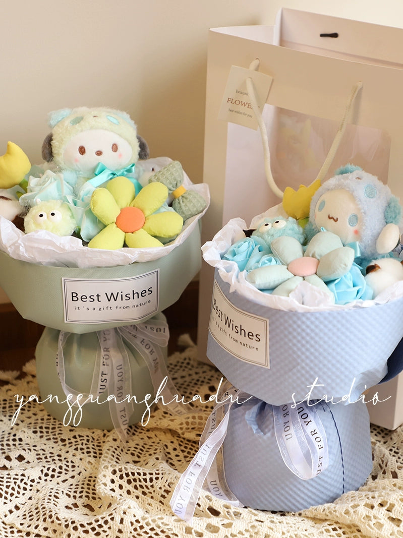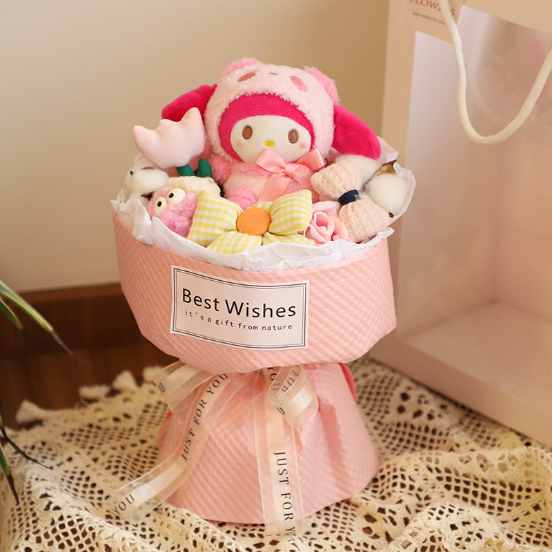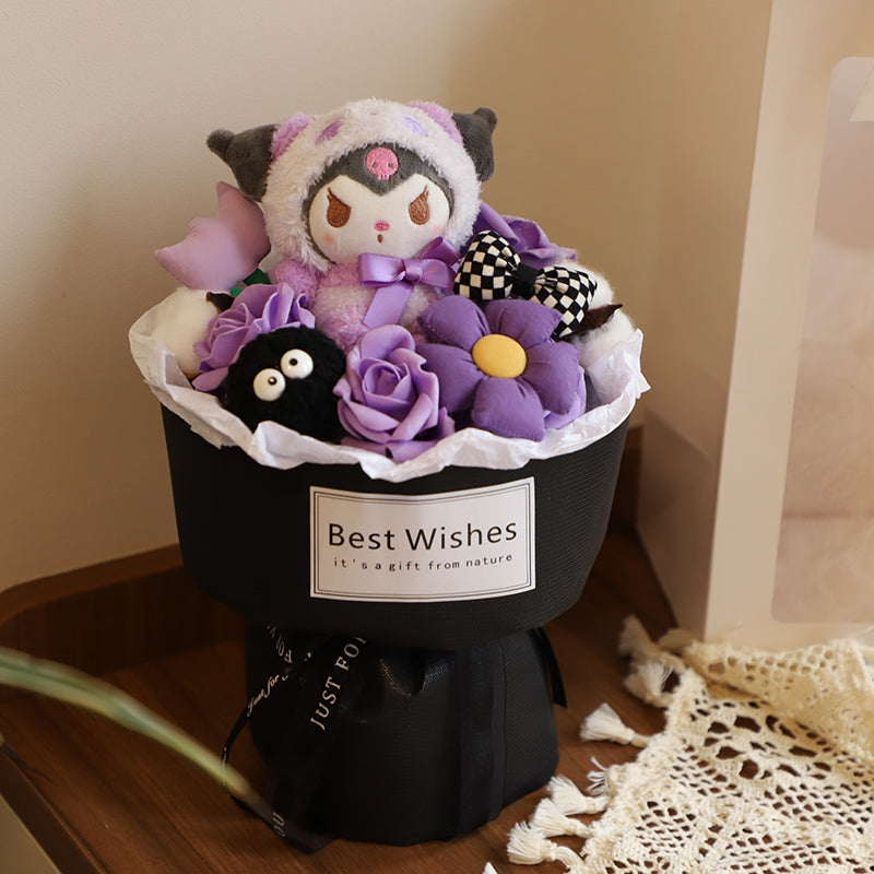 Introducing the Sanrio Bouquet Gift - a heartwarming and utterly adorable way to express your affection for that special someone in your life. Whether it's for your best friend, girlfriend, or a beloved teacher, this enchanting Kuromi doll plush doll bouquet is the perfect gift for any occasion, from birthdays to Teacher's Day. Inside this enchanting bouquet, you'll discover an array of iconic Sanrio characters, including Cinnamonroll, My Melody, Pochacco, and PomPomPurin, nestled amongst a fragrant and beautifully handcrafted arrangement. Measuring approximately 30CM in height and boasting a diameter of 25CM, this bouquet is a delightful blend of cuteness and charm. But that's not all! We've thoughtfully included a greeting card that can be personalized with your heartfelt message, adding a personal touch to your gift. As an extra token of appreciation, every Sanrio Bouquet Gift comes with a complimentary handbag and delicate light strings, making it a truly enchanting and memorable present.