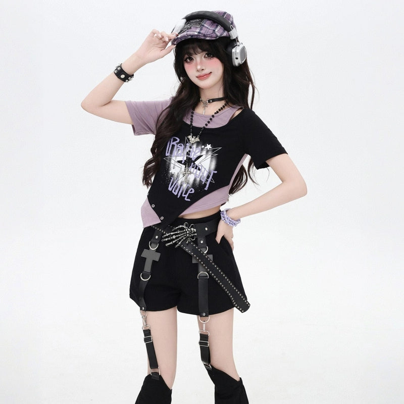 Soft Asian Style Contrast Color Fake Two-Piece T-shirt combines sweetness and coolness! Enjoy a comfortable fit in stylish black and gray or purple tones this summer.