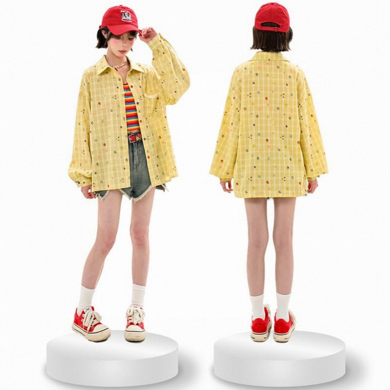 Summer Sweet Girl Style: Embrace warmth with our yellow star print blouse! Featuring a loose fit, lace details, and pockets—perfect for playful summer days.