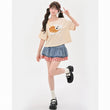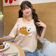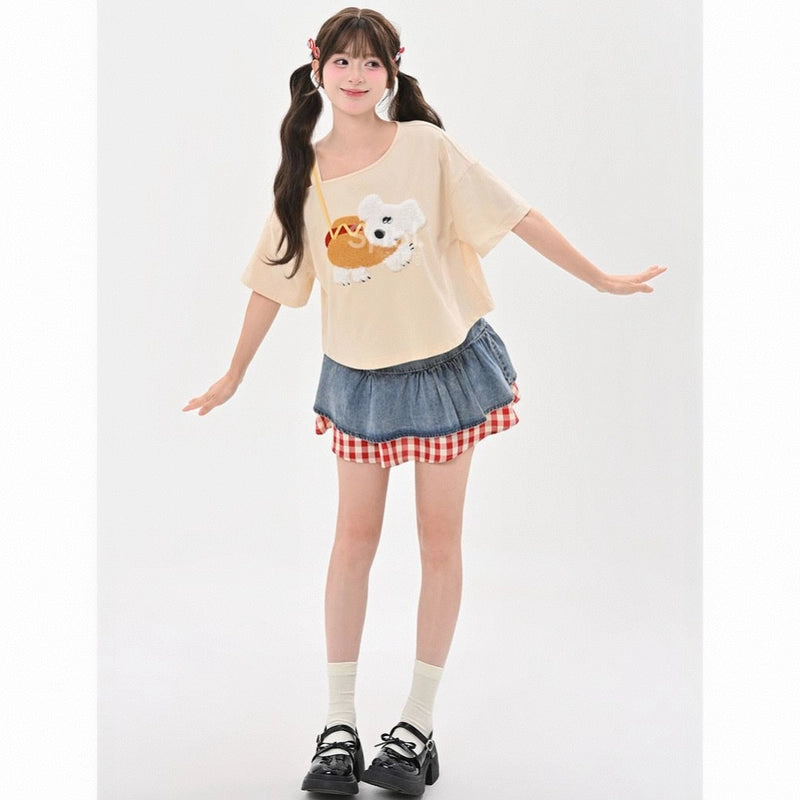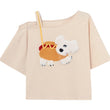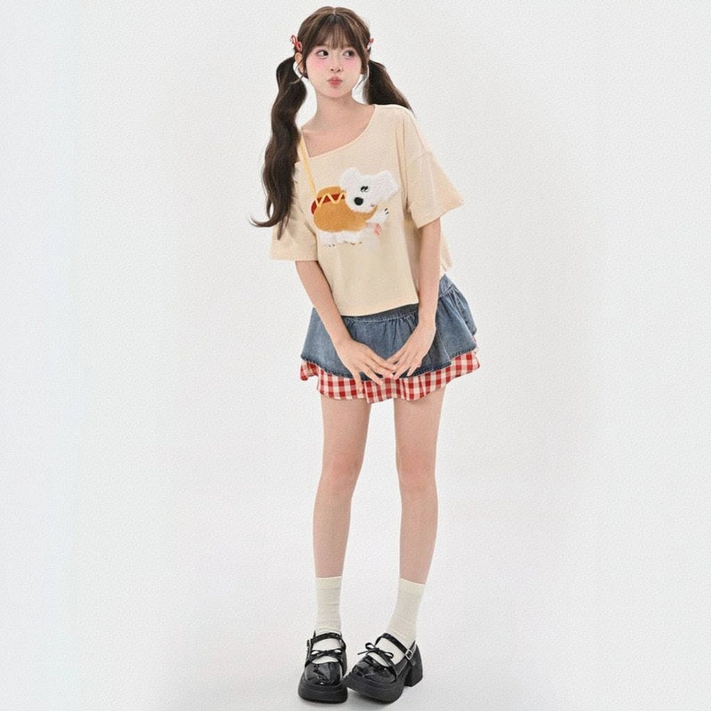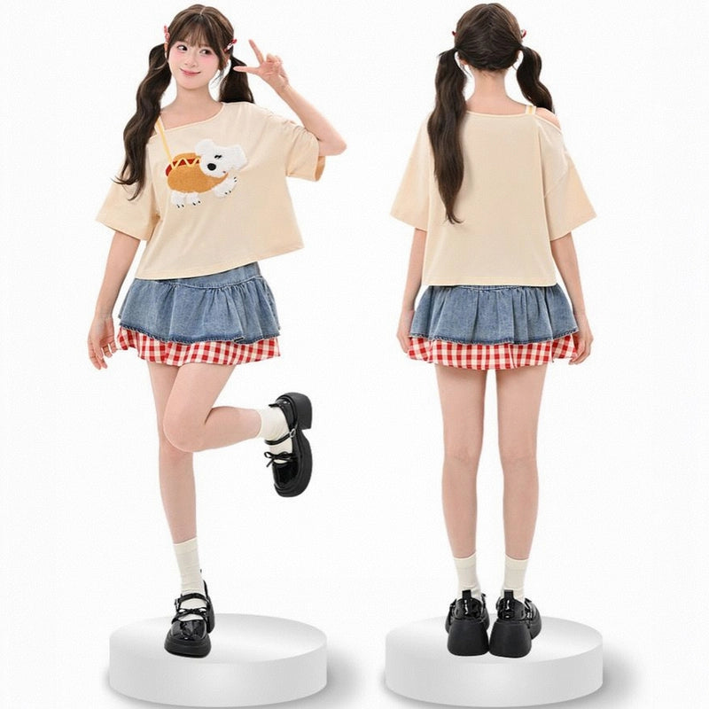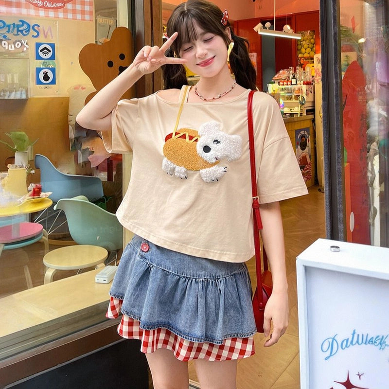 Summer Sweet Style Apricot Puppy T-shirt: Embrace cuteness with this off-shoulder, loose top. Perfect for sunny days! Available in S, M, L.