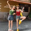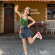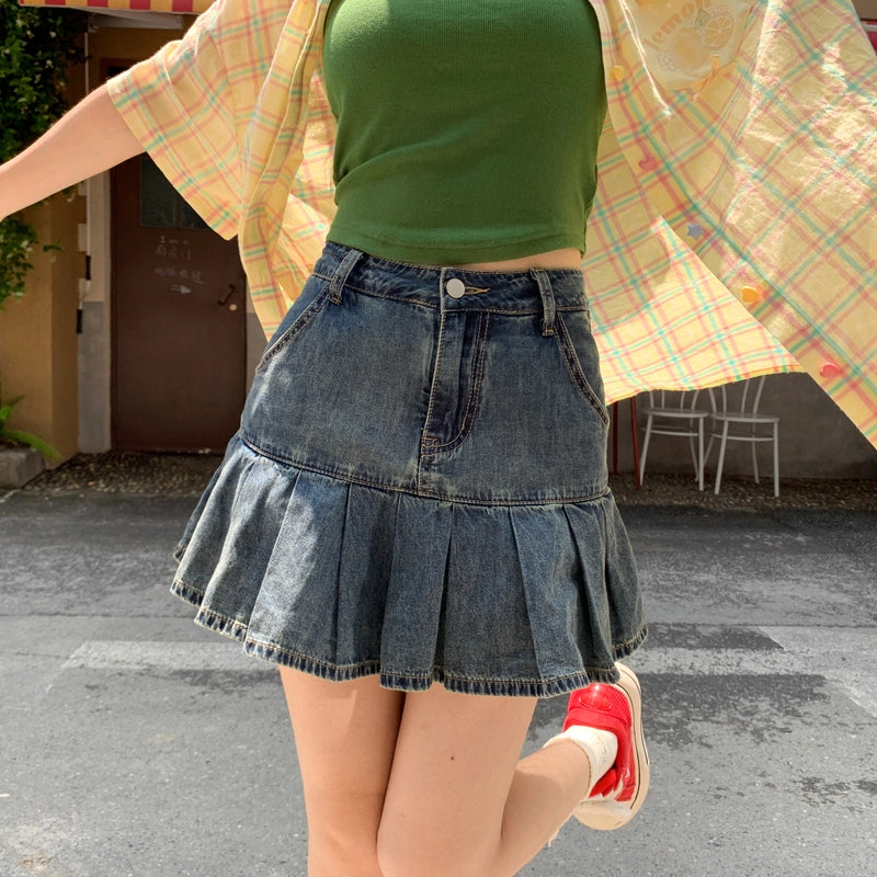 Blue All-match Denim Pleated Skirt: Elevate your summer wardrobe with this slimming high-waist design. Stylish pockets and comfy cotton blend for daily wear!