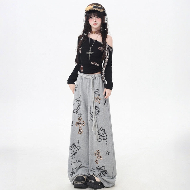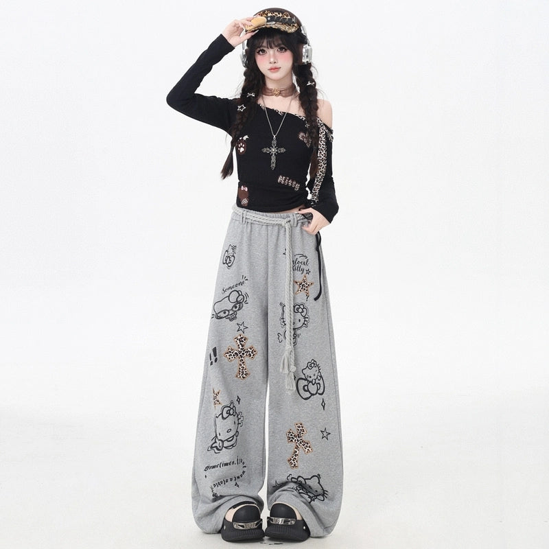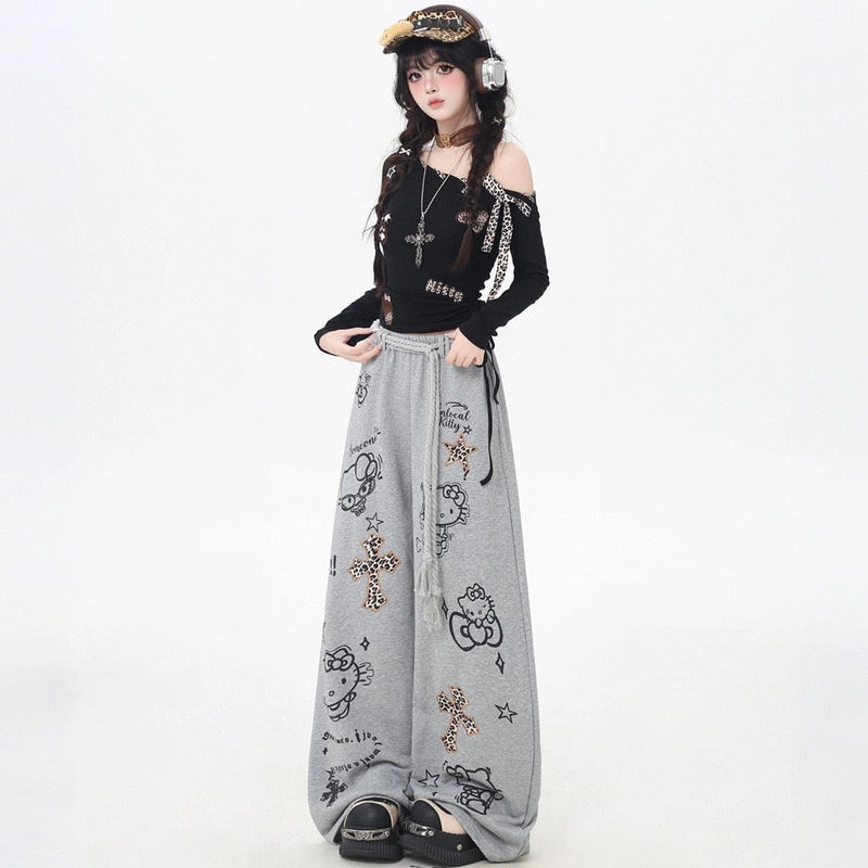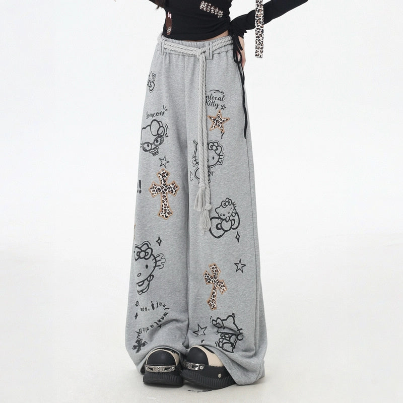 Sweet Cool Hello Kitty Graffiti Print Casual Pants offer versatile style with a high-rise fit. Perfect for fall, available in sizes S to L!