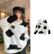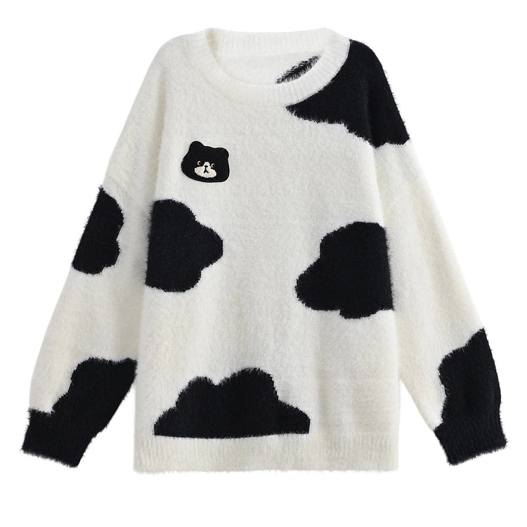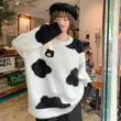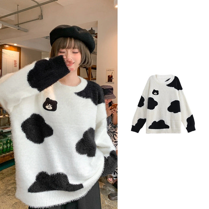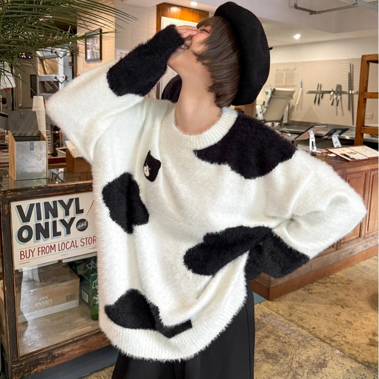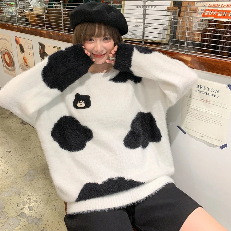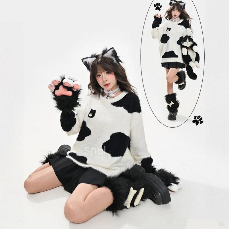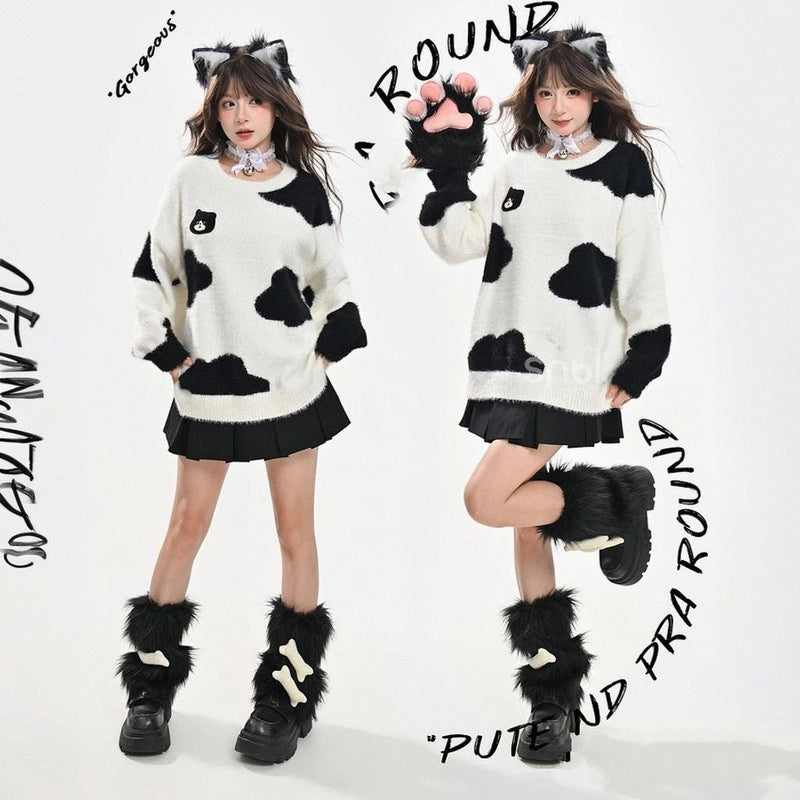 Stay stylishly cosy with our Sweet and Cute Cartoon Cat Embroidered Sweater. Featuring a playful black-and-white cow print design accented with a charming cat appliqué, this loose-fit knit blends kawaii sweetness with a trendy twist. Made from a soft and comfortable mix of acrylic, polyester, and nylon, it’s perfect for layering through fall and winter. The contrast colours and round neckline make it versatile for everyday wear—whether paired with skirts for a girly vibe or jeans for a casual look. Available in white, sizes S, M, L, this sweater brings fun, comfort, and cuteness to any outfit.