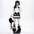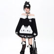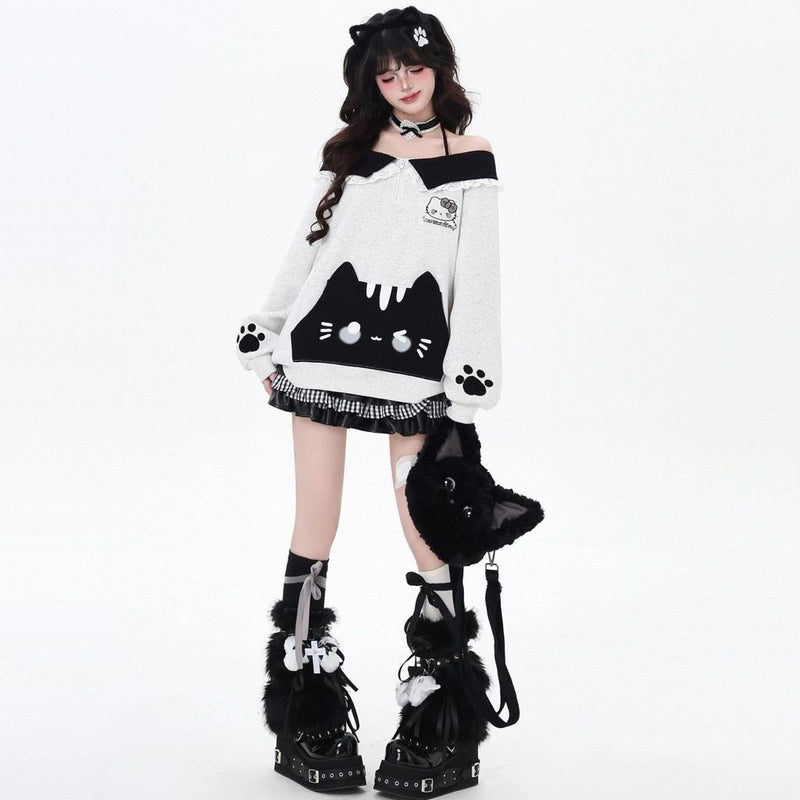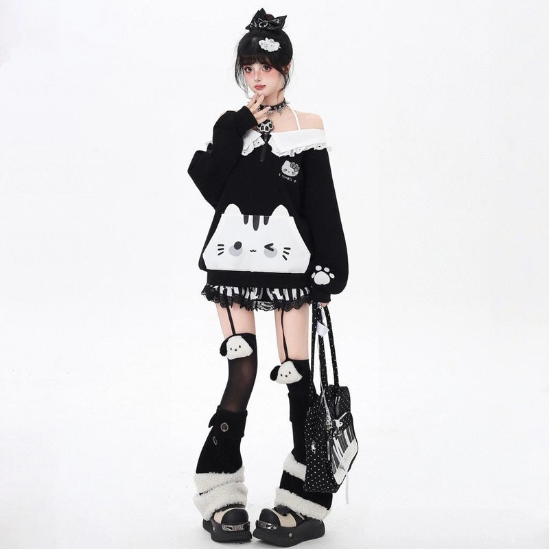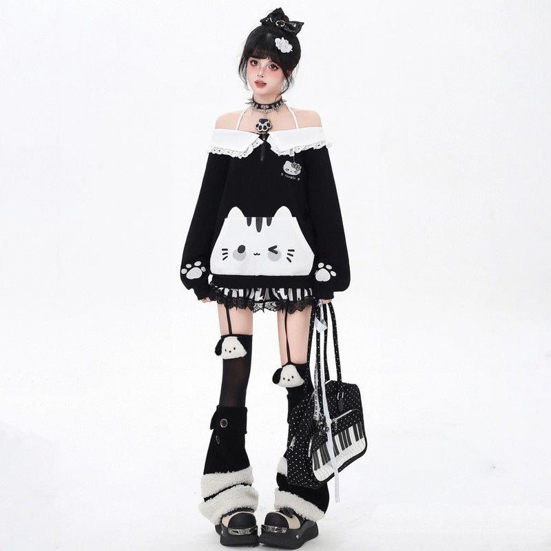 Cartoon Cat Halter Neck Sweatshirt — sweet girl style with lace edge and heart design. Loose, versatile, S-L. Choose black or light gray!