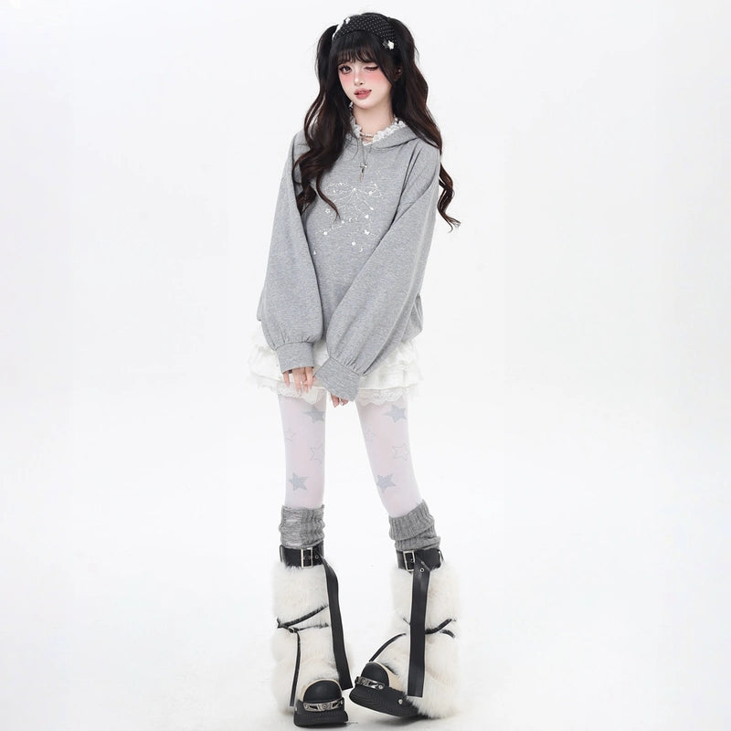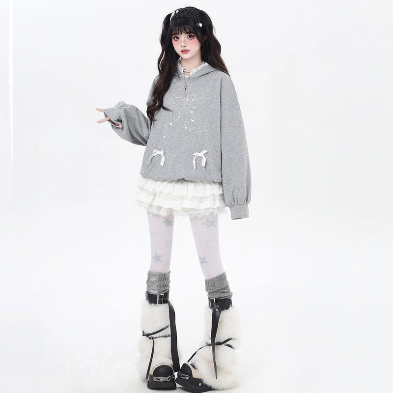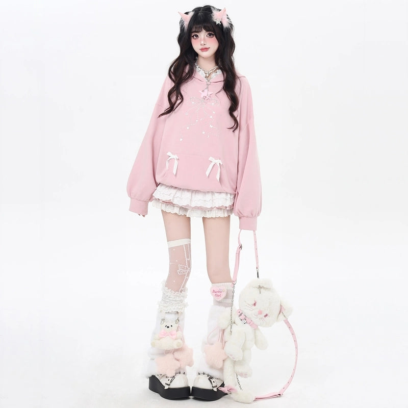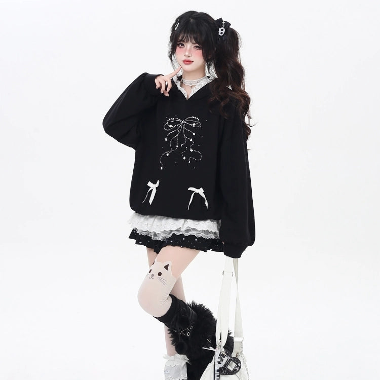 Sweet Girly Bow Rhinestone Hooded Loose Sweatshirt