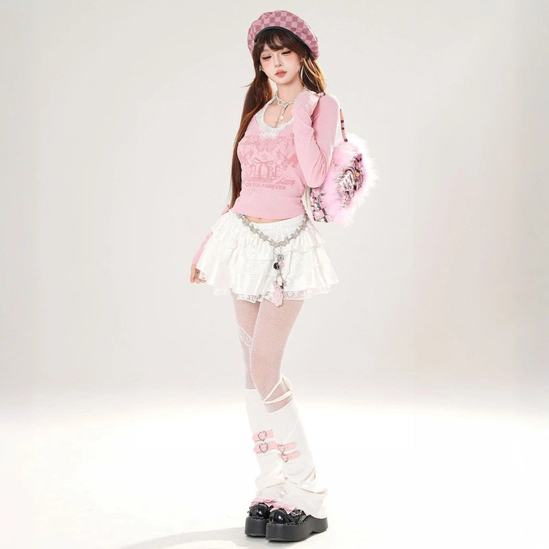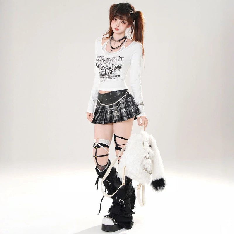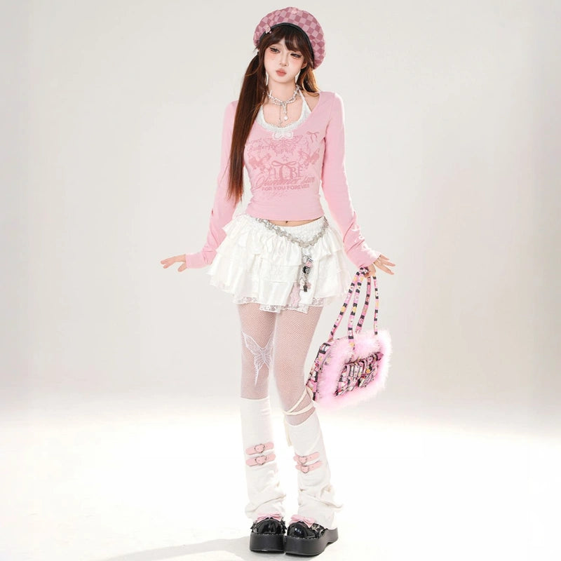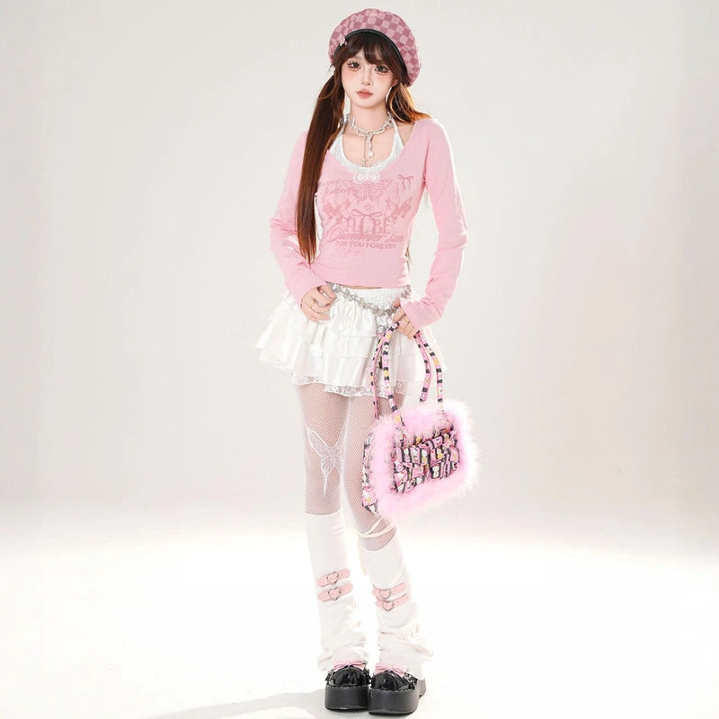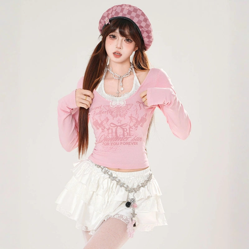 Sweet girly pink butterfly print halterneck T-shirt: off-shoulder, long-sleeved, and slimming for autumn. Available in white and pink. Shop now!