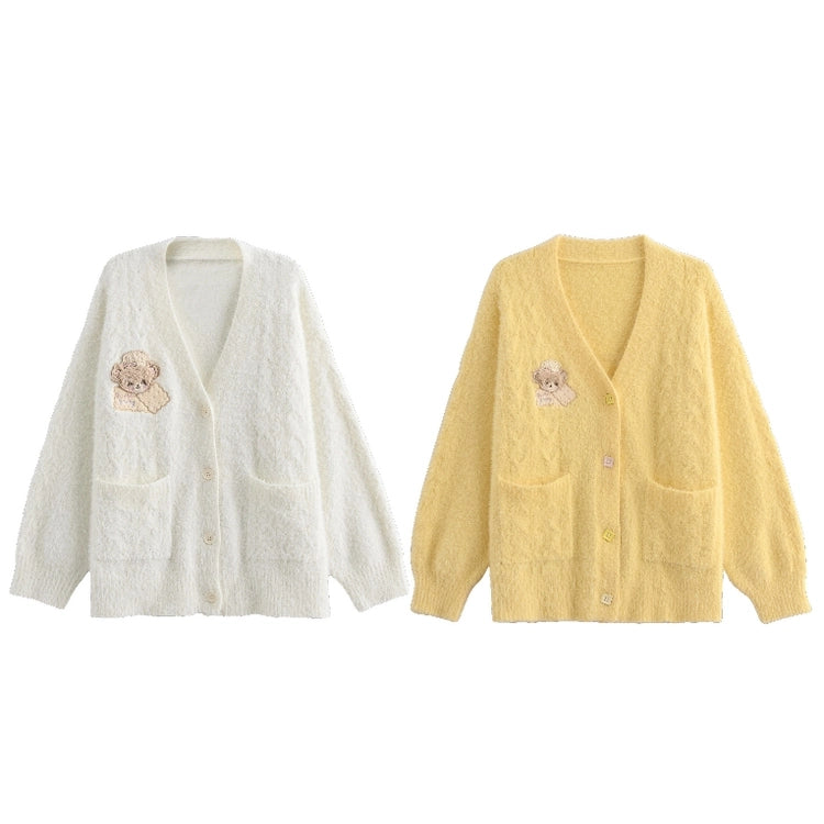 Loose Women's Autumn Sweater: Snuggle into our adorable bear embroidered cardigan! A must-have for sweet style lovers, available in yellow and white.