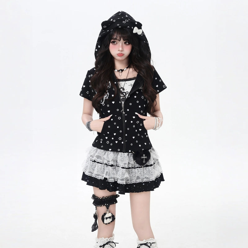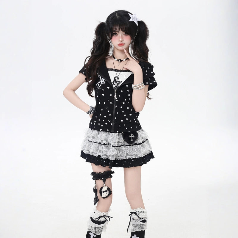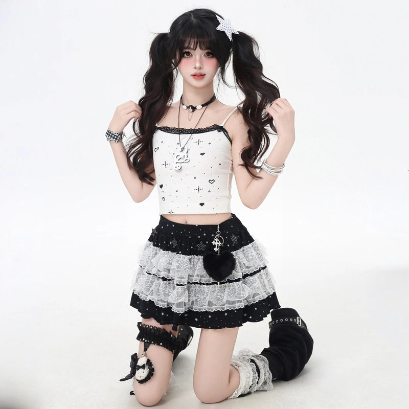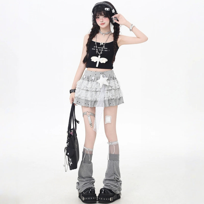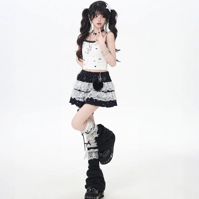 Sweet Girly Style Lace Star Embellished Skirt! This cute high-waisted cake skirt features a knitted bottom, perfect for teens. Available in S, M, L!