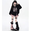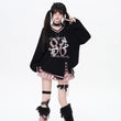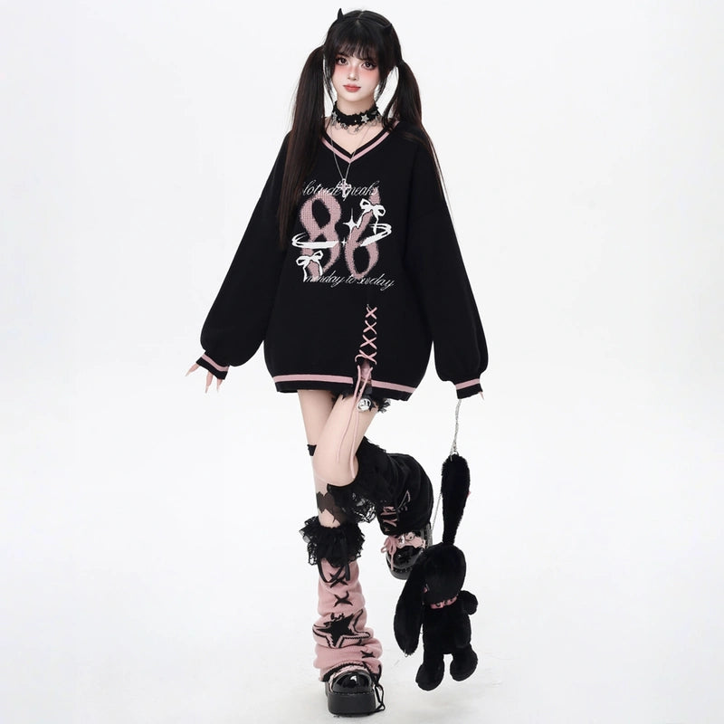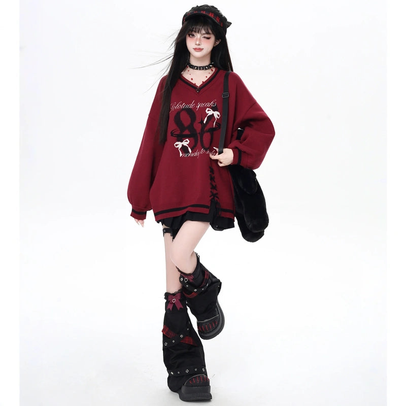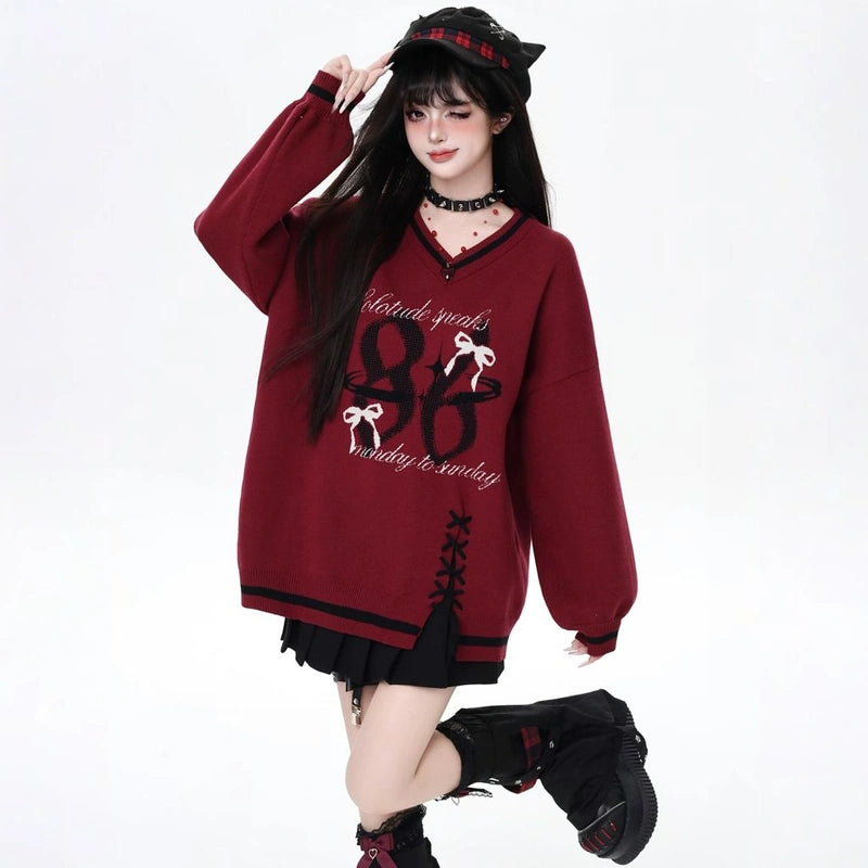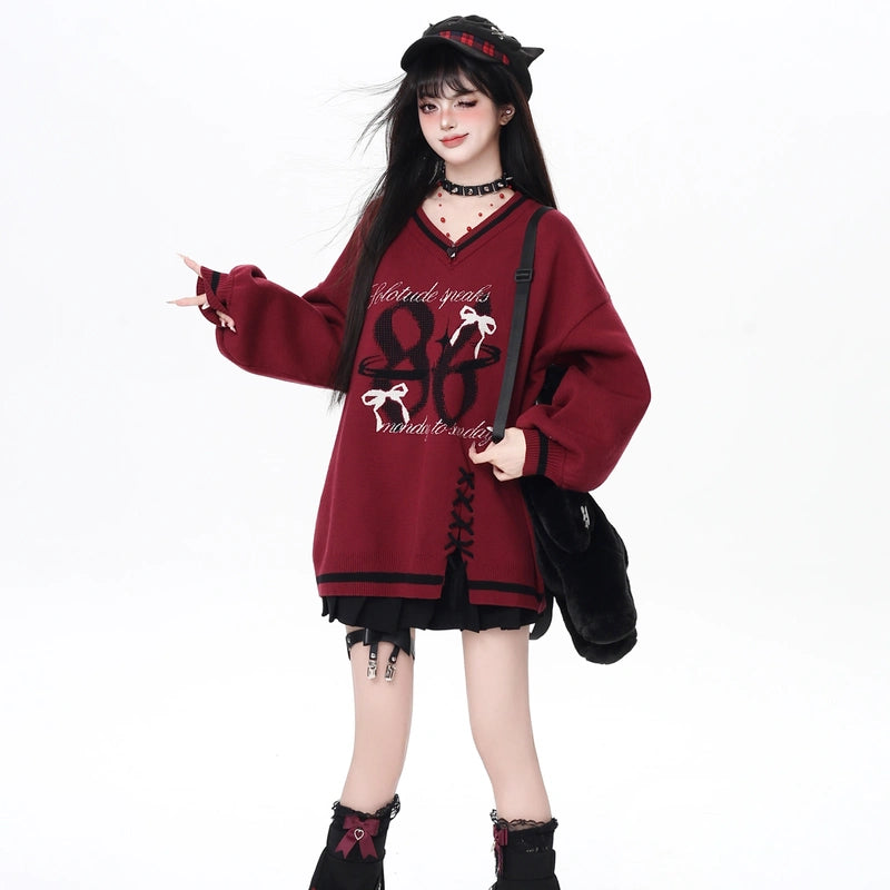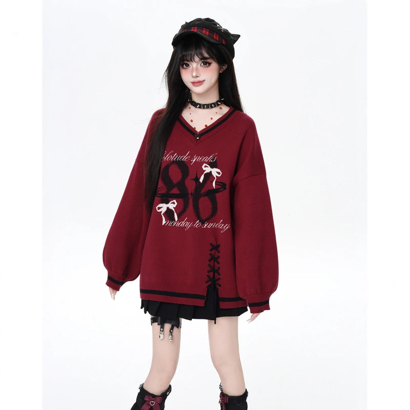 V-Neck Loose Sweater in Sweet Preppy Style! Embrace fall with our lace-up design available in red and black. Get yours today in S, M, or L!