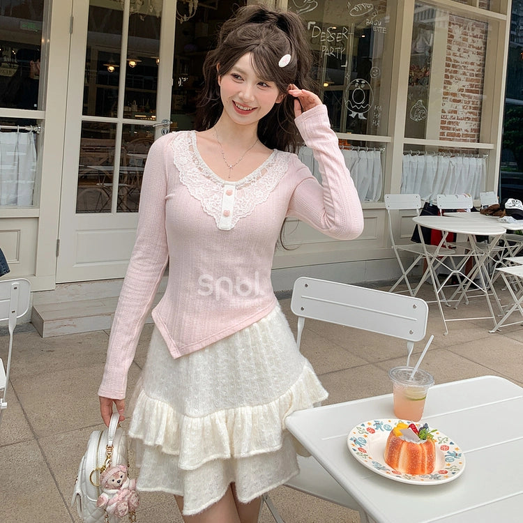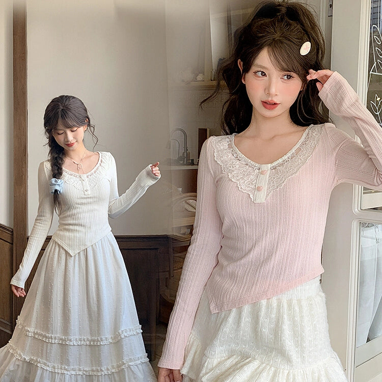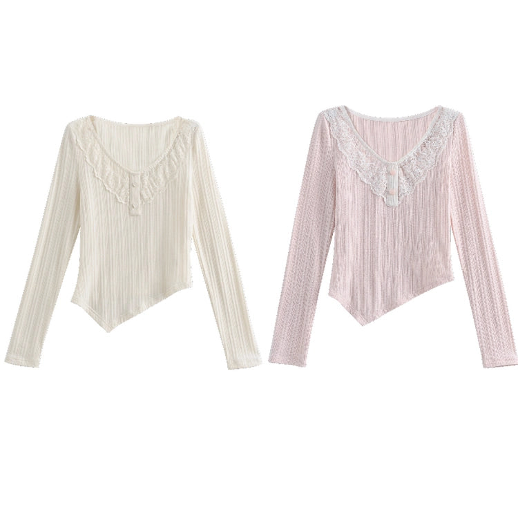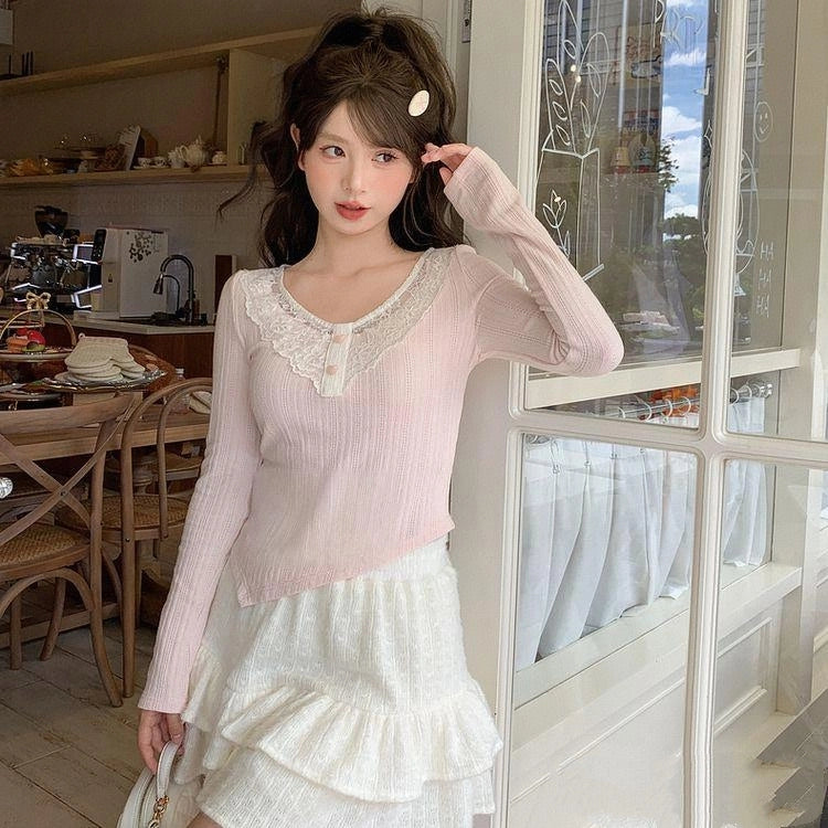 Elevate your fall wardrobe with our Sweet Style Solid Color Irregular Knit Long-Sleeved T-Shirt. Designed with a slim fit and crafted from a comfortable blend of polyester, cotton, and spandex, this knit top combines softness with stretch for an elegant silhouette. The irregular cut and delicate lace details add a touch of kawaii charm, making it perfect for pairing with skirts, jeans, or layered outfits. Available in off-white and pink, this versatile piece is a must-have for sweet-style fashion lovers. Offered in sizes S, M, L, it’s ideal for casual wear or dressed-up looks.