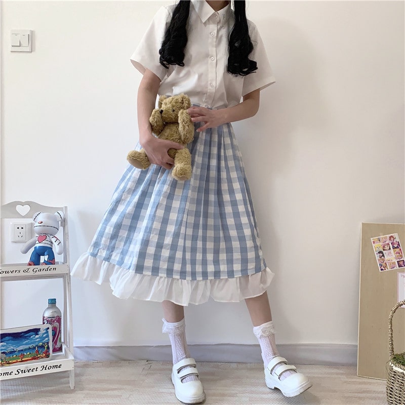 Looking for a skirt that is both stylish and comfortable? Then this Sweet Teen Girl Plaid Vintage Long Skirt is perfect for you! Made from a soft and lightweight fabric, this skirt will keep you cool and comfortable all day long. The plaid print and vintage style makes it perfect for any occasion, while the ruffle detail adds a touch of femininity. And with the over-the-knee length, this Kawaii skirt is sure to turn heads wherever you go!